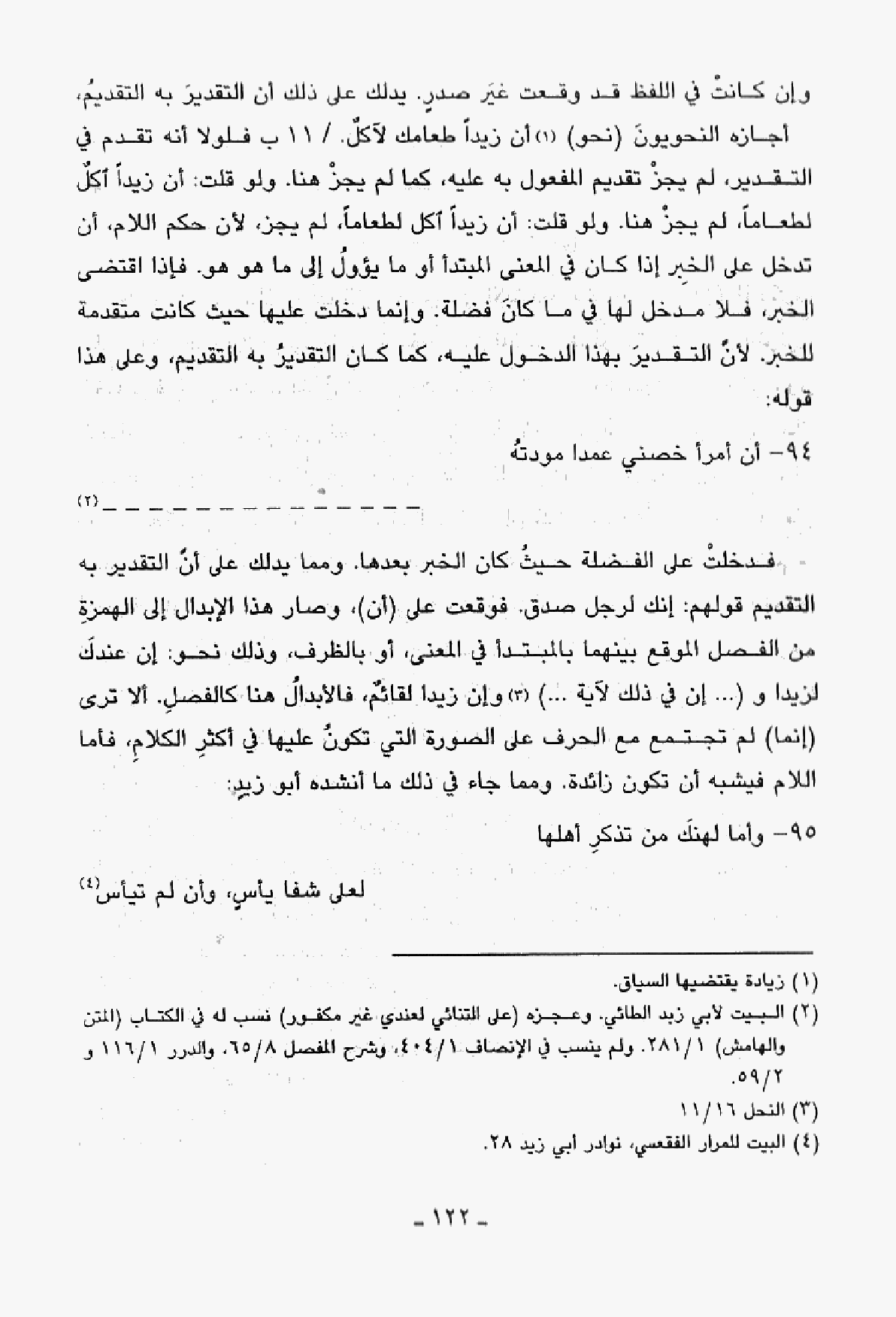. . . . . . . . . . . . . . . . . . . . . فدخلت على الفضلة حيث كان الخبر بعدها. ومما يدلك على أنَّ التقدير به التقديم قولهم: إنك لرجل صدق. فوقعت على (أن)، وصار هذا الإبدال إلى الهمزة من الفصل الموقع بينهما بالمبتدأ في المعنى، أو بالظرف، وذلك نحو: إن عندك لزيدا و (.... إن في ذلك لآية .....) وإن زيدا لقائم، فالأبدال هنا كالفصل. ألا ترى (إنما) لم تجتمع مع الحرف على الصورة التي تكون عليها في أكثر الكلام، فأما اللام فيشبه أن تكون زائدة. ومما جاء في ذلك ما أنشده أبو زيد: