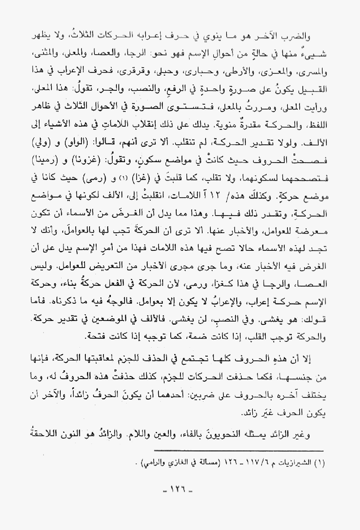 والضرب الآخر هو ما ينوي في حرف إعرابه الحركات الثلاث، ولا يظهر شيء منها في حالة من أحوال الإسم فهو نحو: الرجا، والعصا، والمعلى، والمثنى، والمسرى، والمعزى، والأرطى، وحبارى، وحبلى، وقرقرى، فحرف الإعراب في هذا القبيل يكون على صورة واحدة في الرفع، والنصب، والجر، تقول: هذا المعلى، ورأيت المعلى، ومررت بالمعلى، فتستوى الصورة في الأحوال الثلاث في ظاهر اللفظ، والحركة مقدرة منوية. يدلك على ذلك إنقلاب اللامات في هذه الأشياء إلى الألف. ولولا تقدير الحركة، لم تنقلب. ألا ترى أنهم، قالوا: (الواو) و (ولي) فصحت الحروف حيث كانت في مواضع سكون، وتقول: (غزونا) و (رمينا) فتصححهما لسكونهما، ولا تقلب، كما قلبت في (غزا) و (رمى) حيث كانا في موضع حركة. وكذلك هذه/ 12 آاللامات، انقلبت إلى، الألف لكونها في مواضع الحركة، وتقدر ذلك فيها. وهذا مما يدل أن الغرض من الأسماء أن تكون معرضة للعوامل، والأخبار عنها. ألا ترى أن الحركة تجب لها بالعوامل، وأنك لا تجد لهذه الأسماء حالا تصح فيها هذه اللامات فهذا من أمر الإسم يدل على أن الغرض فيه الأخبار عنه، وما جرى مجرى الأخبار من التعريض للعوامل. وليس العصا، والرجا في هذا كغزا، ورمى، لأن الحركة في الفعل حركة بناء، وحركة الإسم حركة إعراب، والإعراب لا يكون إلا بعوامل. فالوجه فيه ما ذكرناه. فأما قولك: هو يغشى. وفي النصب، لن يغشى. فالألف في الموضعين في تقدير حركة. والحركة توجب القلب، إذا كانت ضمة، كما توجبه إذا كانت فتحة.