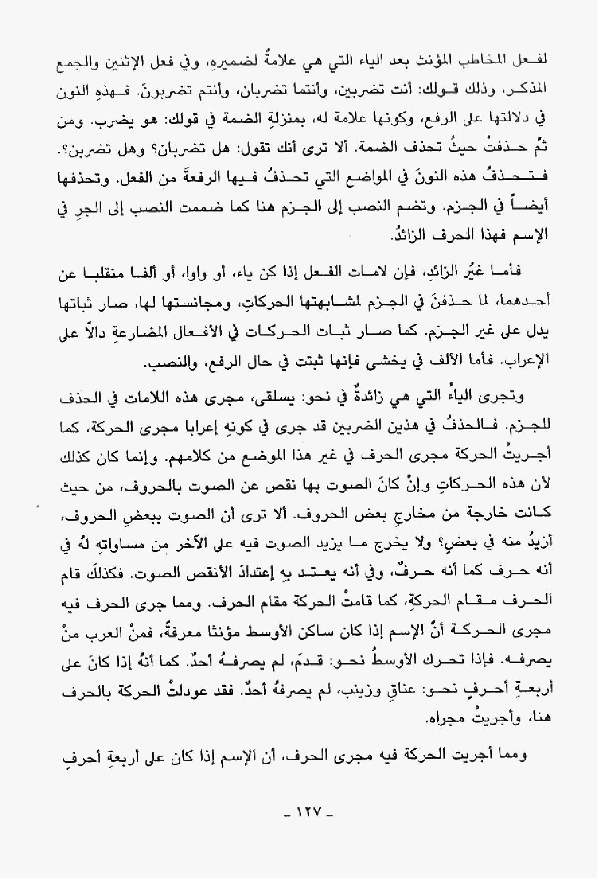 لفعل المخاطب المؤنث بعد الياء التي هي علامة لضميره، وفي فعل الاثنين والجمع المذكر، وذلك قولك: أنت تضربين، وأنتما تضربان، وأنتم تضربون. فهذه النون في دلالتها على الرفع، وكونها علامة له، بمنزلة الضمة في قولك: هو يضرب. ومن ثم حذفت حيث تحذف الضمة. ألا ترى أنك تقول: هل تضربان؟ وهل تضربن؟. فتحذف هذه النون في المواضع التي تحذف فيها الرفعة من الفعل. وتحذفها أيضًا في الجزم. وتضم النصب إلى الجزم هنا كما ضممت النصب إلى الجر في الإسم فهذا الحرف الزائد.