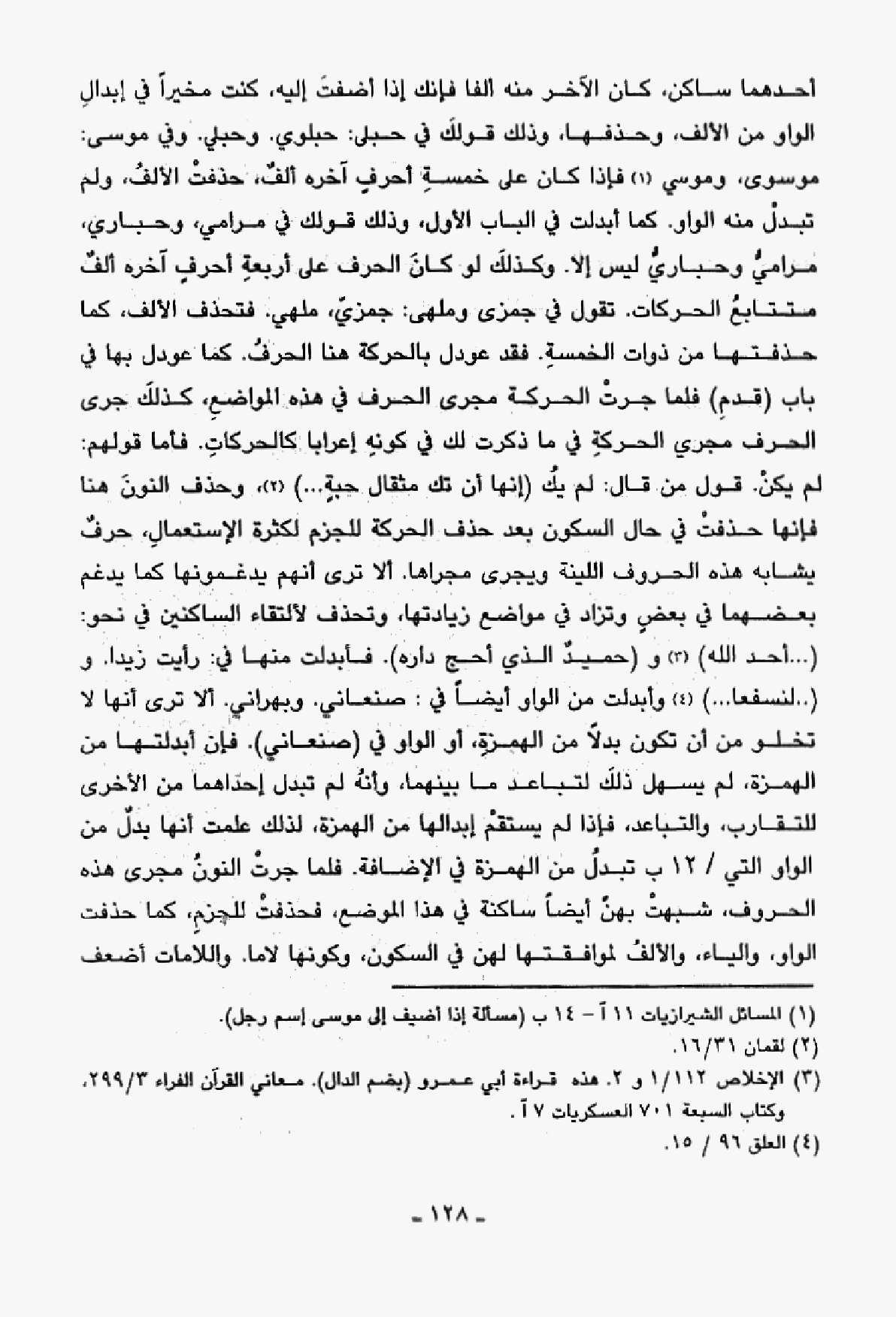 أحدهما ساكن، كان الآخر منه ألفا فإنك إذا أضفت إليه، كنت مخيرًا في إبدال الواو من الألف، وحذفها، وذلك قولك في حبلى: حبلوي. وحبلي. وفي موسى: موسوى، وموسي فإذا كان على خمسة أحرف آخره ألف، حذفت الألف، ولم تبدل منه الواو. كما أبدلت في الباب الأول، وذلك قولك في مرامي، وحباري، مرامي وحباري ليس إلا. وكذلك لو كان الحرف على أربعة أحرف آخره ألف متتابع الحركات. تقول في جمزى وملهى: جمزيّ، ملهي. فتحذف الألف، كما حذفتها من ذوات الخمسة. فقد عودل بالحركة هنا الحرف. كما عودل بها في باب (قدم) فلما جرت الحركة مجرى الحرف في هذه المواضع، كذلك جرى الحرف مجري الحركة في ما ذكرت لك في كونه إعرابا كالحركات. فأما قولهم: لم يكن. قول من قال: لم يك (إنها أن تك مثقال حبة ...)، وحذف النون هنا فإنها حذفت في حال السكون بعد حذف الحركة للجزم لكثرة الاستعمال، حرف يشابه هذه الحروف اللينة ويجرى مجراها. ألا ترى أنهم يدغمونها كما يدغم بعضهما في بعض وتزاد في مواضع زيادتها، وتحذف لألتقاء الساكنين في نحو: (... أحد الله) و (حميد الذي أحج داره). فأبدلت منها في: رأيت زيدا. و (لنسفعا ...) وأبدلت من الواو أيضًا في: صناعني. وبهراني. ألا ترى أنها لا تخلو من أن تكون بدلاً من الهمزة، أو الواو في (صنعاني). فإن أبدلتها من الهمزة، لم يسهل ذلك لتباعد ما بينهما، وأنه لم تبدل إحداهما من الأخرى للتقارب، والتباعد، فإذا لم يستقم إبدالها من الهمزة، لذلك علمت أنها بدل من الواو التي /12 ب تبدل من الهمزة في الإضافة. فلما جرت النون مجرى هذه الحروف، شبهت بهن أيضًا ساكنة في هذا الموضع، فحذفت للجزم، كما حذفت الواو، والياء، والألف لموافقتها لهن في السكون، وكونها لاما. واللامات أضعف