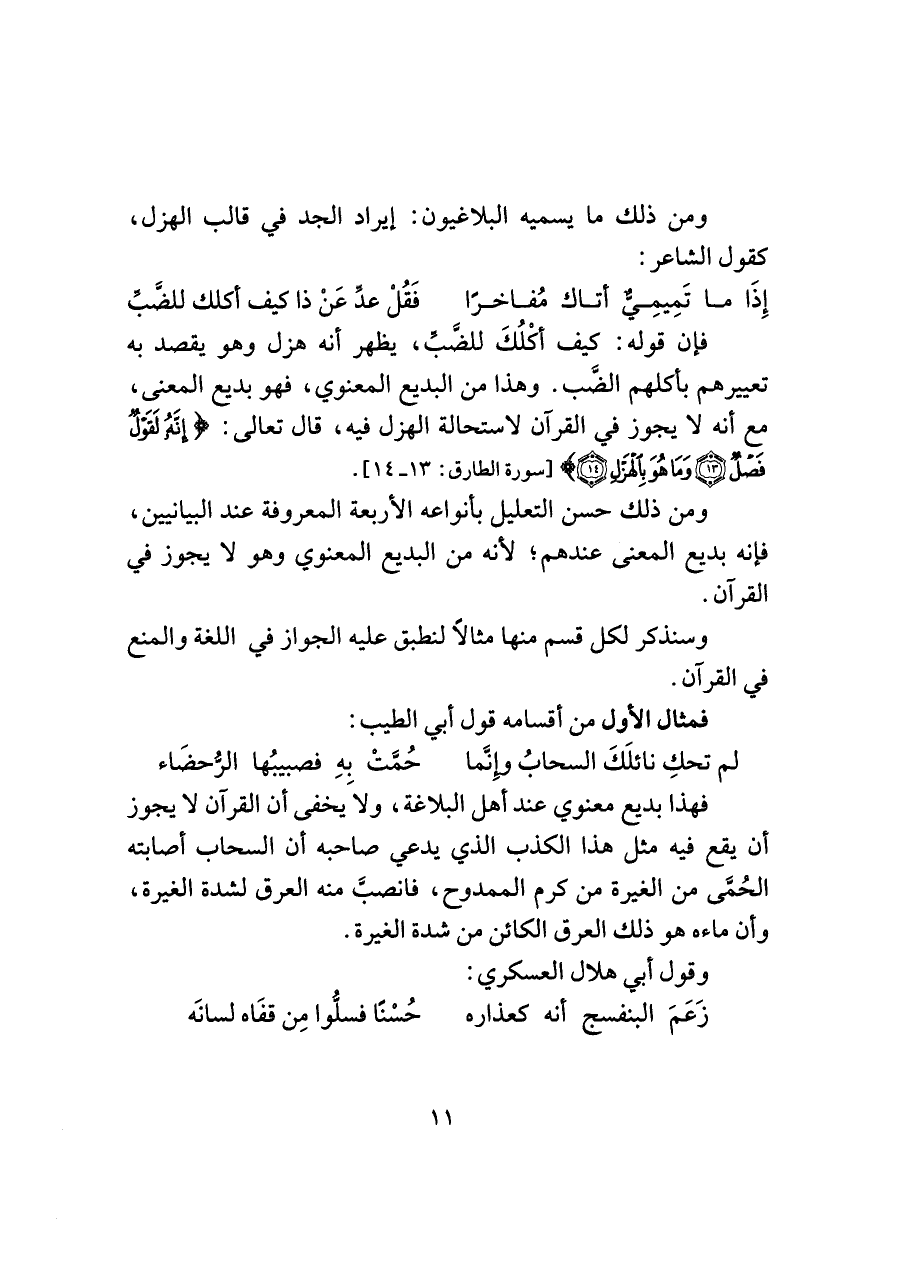 ومن ذلك حسن التعليل بأنواعه الأربعة المعروفة عند البيانيين، فإنه بديع المعنى عندهم؛ لأنه من البديع المعنوي وهو لا يجوز في القرآن.