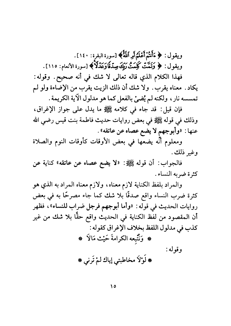 والمراد بلفظ الكناية لازم معناه، ولازم معناه المراد به الذي هو كثرة ضرب النساء واقع صدقًا بلا شك كما جاء مصرحًا به في بعض روايات الحديث في قوله: "وأما أبو جهم فرجل ضراب للنساء"، فظهر أن المقصود من لفظ الكناية في الحديث واقع حقًّا بلا شك من غير كذب في مدلول اللفظ بخلاف الإغراق كقوله: