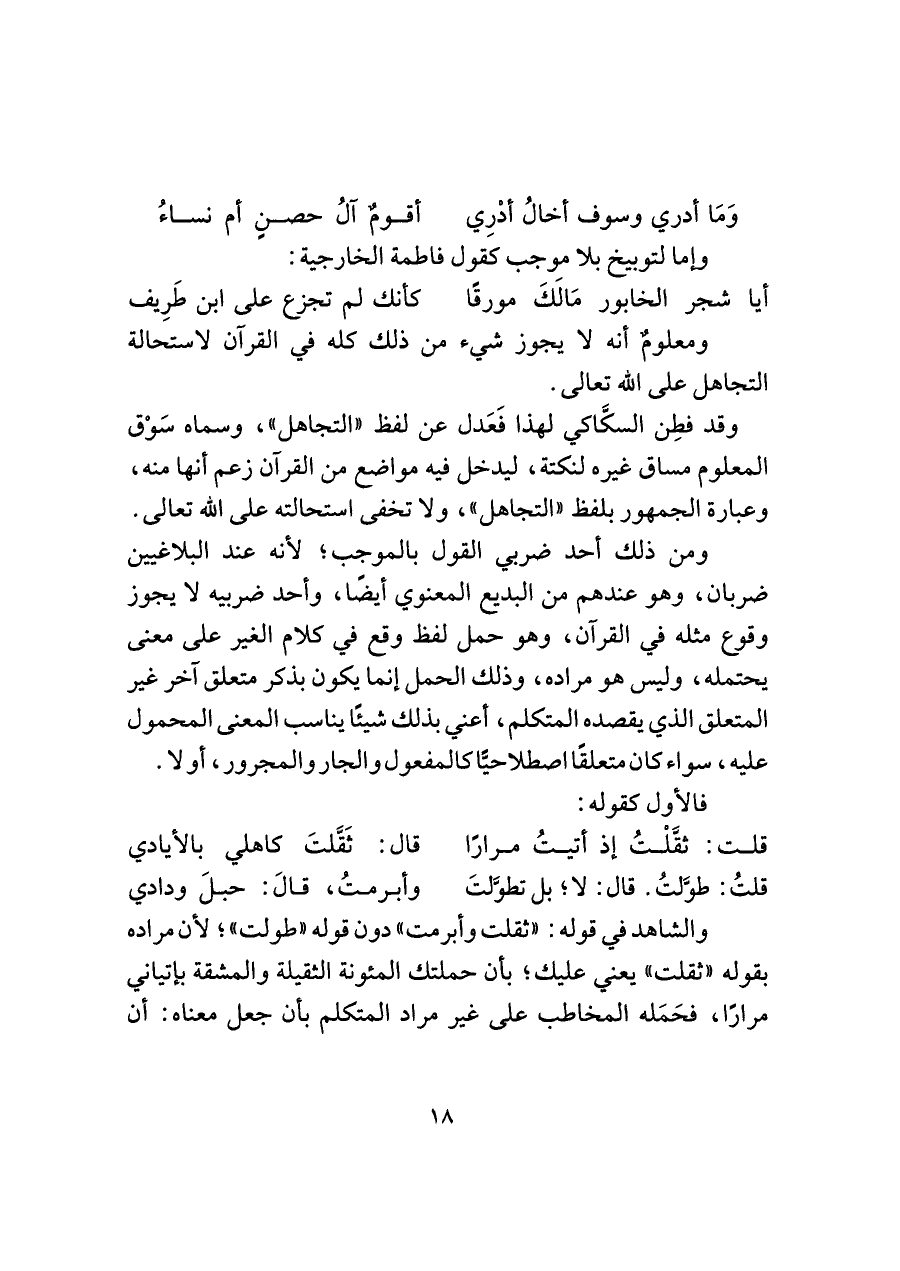 ومن ذلك أحد ضربي القول بالموجب؛ لأنه عند البلاغيين ضربان، وهو عندهم من البديع المعنوي أيضًا، وأحد ضربيه لا يجوز وقوع مثله في القرآن، وهو حمل لفظ وقع في كلام الغير على معنى يحتمله، وليس هو مراده، وذلك الحمل إنما يكون بذكر متعلق آخر غير المتعلق الذي يقصده المتكلم، أعني بذلك شيئًا يناسب المعنى المحمول عليه، سواء كان متعلقًا اصطلاحيًّا كالمفعول والجار والمجرور، أو لا.