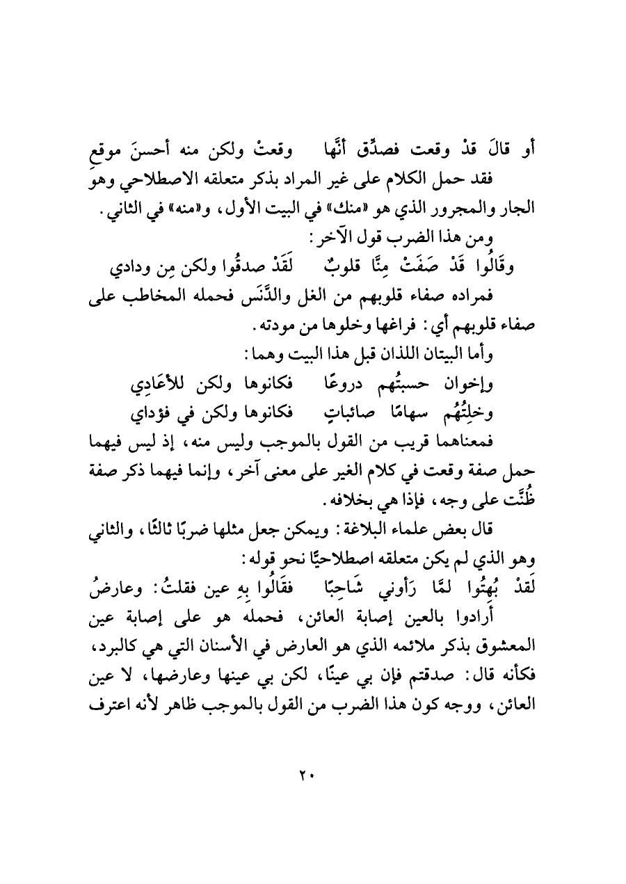 فقد حمل الكلام على غير المراد بذكر متعلقه الاصطلاحي وهو الجار والمجرور الذي هو "منك" في البيت الأول، و"منه" في الثاني.