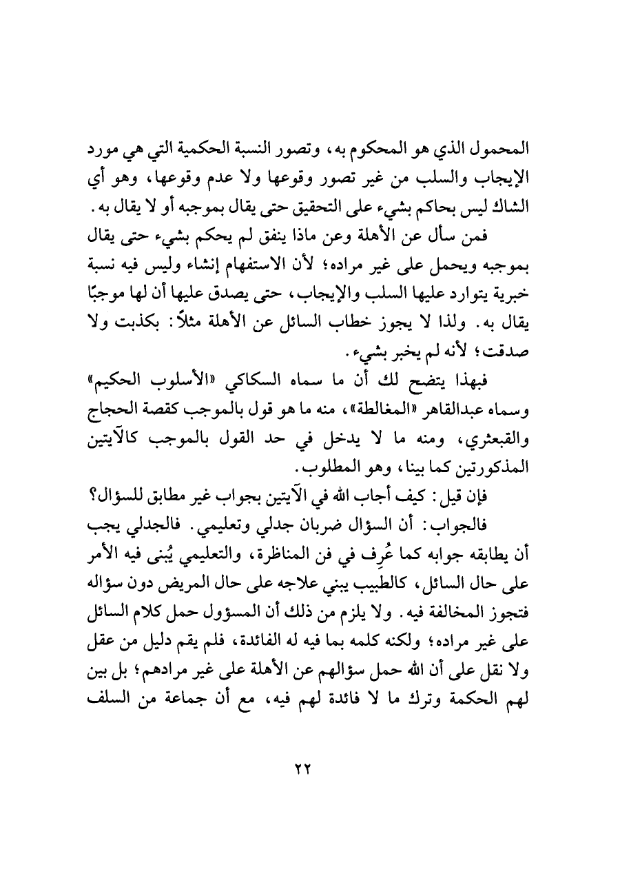 فبهذا يتضح لك أن ما سماه السكاكي "الأسلوب الحكيم" وسماه عبد القاهر "المغالطة"، منه ما هو قول بالموجب كقصة الحجاج والقبعثري، ومنه ما لا يدخل في حد القول بالموجب كالآيتين المذكورتين كما بينا، وهو المطلوب.