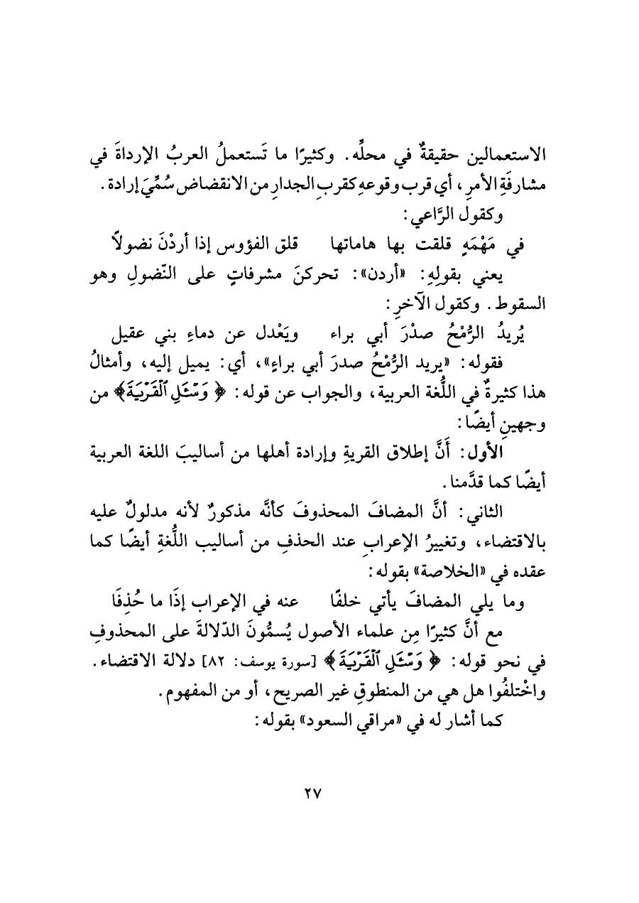 فقوله: "يريد الرُّمْحُ صدرَ أبي براءٍ"، أي: يميل إليه، وأمثالُ هذا كثيرةٌ في اللُّغة العربية، والجواب عن قوله: {وَاسْأَلِ الْقَرْيَةَ} من وجهينِ أيضًا:
