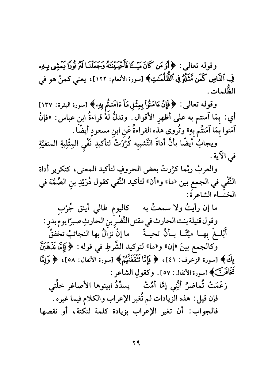 والعربُ ربَّما كرَّرتْ بعض الحروفِ لتأكيد المعنى، كتكرير أداة النَّفْي في الجمعِ بين "ما" و"أن" لتأكيد النَّفي كقول دُرَيدِ بنِ الصِّمَّة في الخنساء الشاعرة: