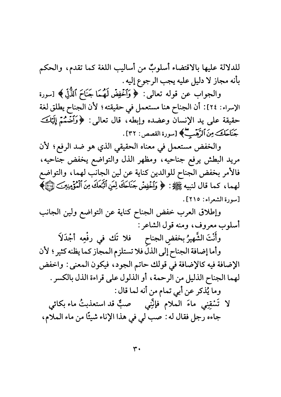 والجواب عن قوله تعالى: {وَاخْفِضْ لَهُمَا جَنَاحَ الذُّلِّ} [سورة الإسراء: ٢٤]: أن الجناح هنا مستعمل في حقيقته؛ لأن الجناح يطلق لغة حقيقة على يد الإنسان وعضده وإبطه، قال تعالى: {وَاضْمُمْ إِلَيكَ جَنَاحَكَ مِنَ الرَّهْبِ} [سورة القصص: ٣٢].