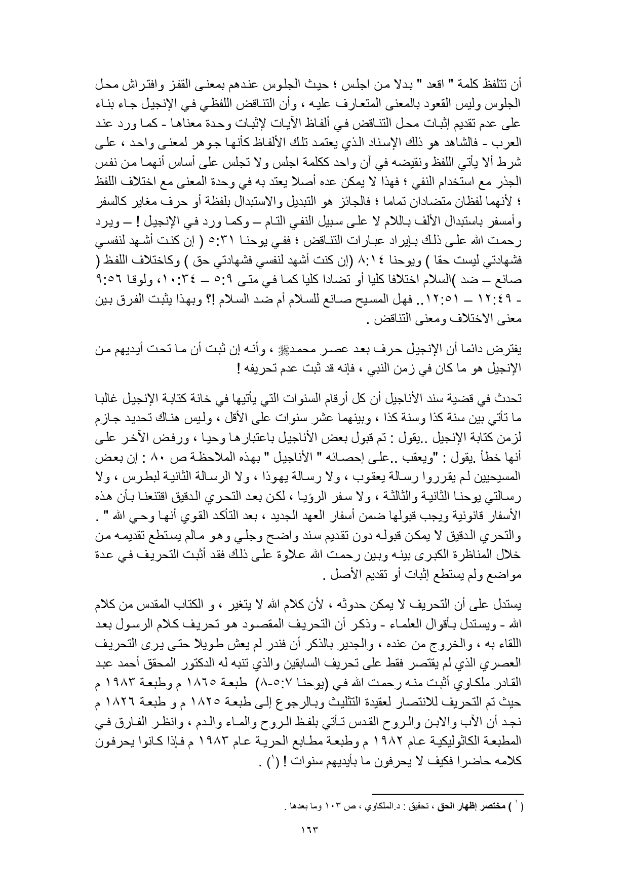 أن تتلفظ كلمة " اقعد " بدلا من اجلس؛ حيث الجلوس عندهم بمعنى القفز وافتراش محل الجلوس وليس القعود بالمعنى المتعارف عليه، وأن التناقض اللفظي في الإنجيل جاء بناء على عدم تقديم إثبات محل التناقض في ألفاظ الآيات لإثبات وحدة معناها - كما ورد عند العرب - فالشاهد هو ذلك الإسناد الذي يعتمد تلك الألفاظ كأنها جوهر لمعنى واحد، على شرط ألا يأتي اللفظ ونقيضه في آن واحد ككلمة اجلس ولا تجلس على أساس أنهما من نفس الجذر مع استخدام النفي؛ فهذا لا يمكن عده أصلا يعتد به في وحدة المعنى مع اختلاف اللفظ؛ لأنهما لفظان متضادان تماما؛ فالجائز هو التبديل والاستبدال بلفظة أو حرف مغاير كالسفر وأمسفر باستبدال الألف باللام لا على سبيل النفي التام - وكما ورد في الإنجيل! - ويرد رحمت الله على ذلك بإيراد عبارات التناقض؛ ففي يوحنا 5: 31 (إن كنت أشهد لنفسي فشهادتي ليست حقا) ويوحنا 8: 14 (إن كنت أشهد لنفسي فشهادتي حق) وكاختلاف اللفظ (صانع - ضد) السلام اختلافا كليا أو تضادا كليا كما في متى 5: 9 - 10: 34، ولوقا 9: 56 - 12: 49 - 12: 51 .. فهل المسيح صانع للسلام أم ضد السلام! ؟ وبهذا يثبت الفرق بين معنى الاختلاف ومعنى التناقض.