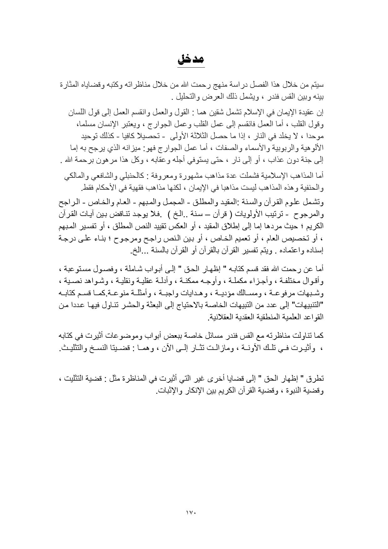 سيتم من خلال هذا الفصل دراسة منهج رحمت الله من خلال مناظراته وكتبه وقضاياه المثارة بينه وبين القس فندر، ويشمل ذلك العرض والتحليل.