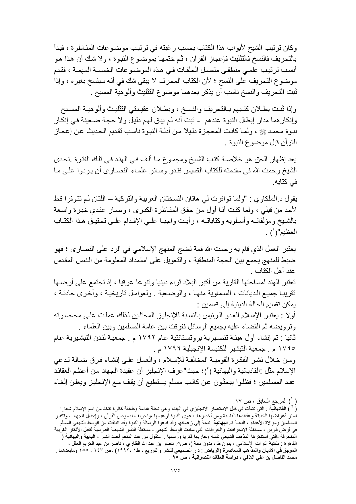 (¬2) القاديانية: التي نشأت في ظل الاستعمار الانجليزي في الهند، وهي نحلة هدامة وطائفة كافرة تتخذ من اسم الإسلام شعارا لستر أغراضها الخبيثة وعقائدها الفاسدة ومن أخطرها: دعوى النبوة لزعيمها، وتحريف نصوص القرآن، وإبطال الجهاد، وتكفير المسلمين وموالاة الأعداء، البابية ثم البهائية: نسبة إلى زعمائها وقد ادعوا الرسالة والنبوة وقد انبثقت من الوسط الشيعي المسلم في أرض فارس، مستغلة الانحرافات والخرافات التي سادت الوسط الشيعي، مستغلة النفس الشيعية الفارسية لتقبل الأفكار الغريبة المنحرفة، التي استنكرها المذهب الشيعي نفسه وحاربها فكريا ورسميا .. منقول من عبد المنعم أحمد النمر، البابية والبهائية (القاهرة: مكتبة التراث الإسلامي، بدون ط، بدون سنة)، ص 5. ناصر بن عبد الله القفاري، ناصر بن عبد الكريم العقل، الموجز في الأديان والمذاهب المعاصرة (الرياض: دار الصميعي للنشر والتوزيع، ط 1، 1992)، ص 143، 155 ومابعدهما. محمد الفاضل بن علي اللافي، دراسة العقائد النصرانية، ص 95.