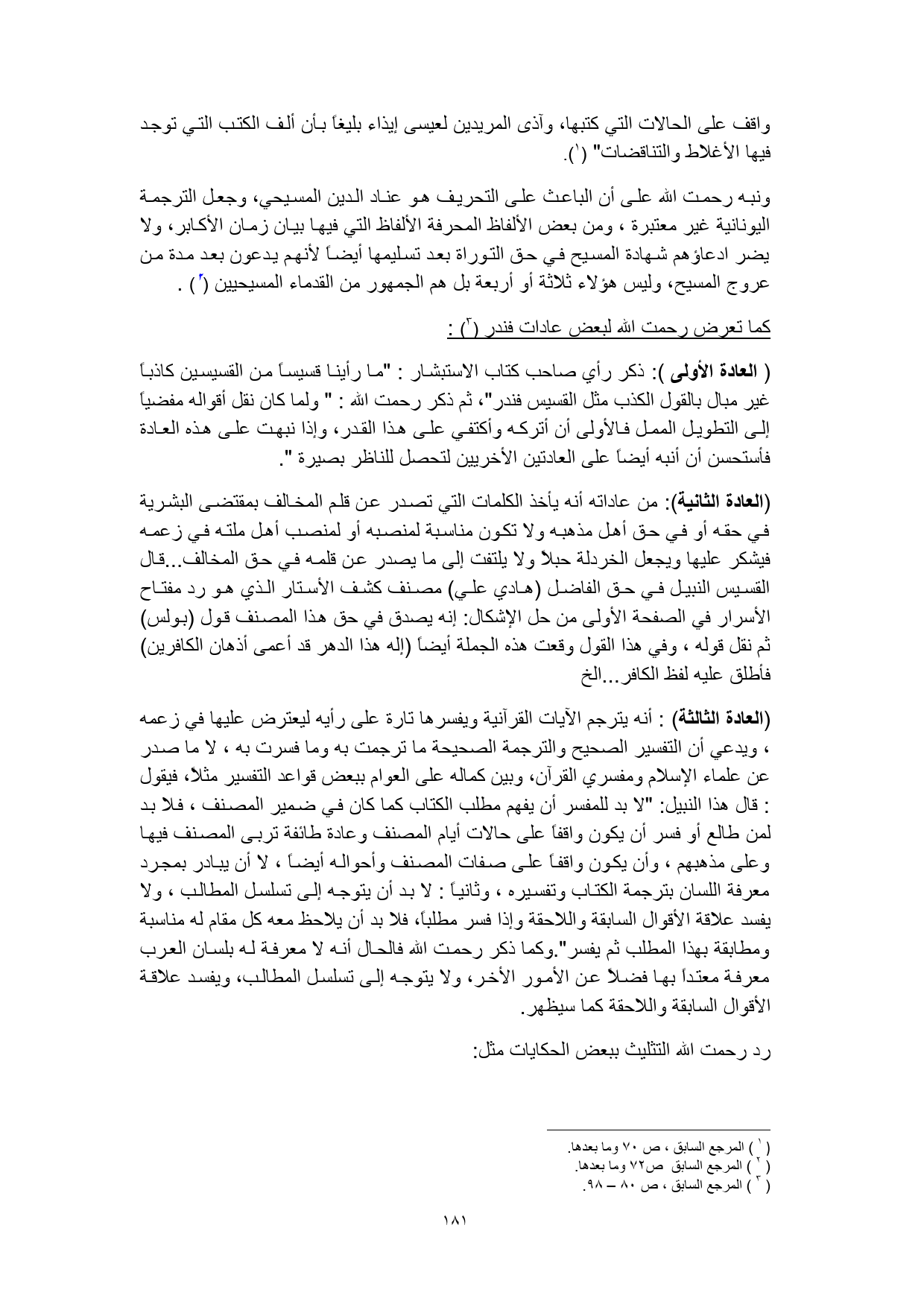 (العادة الثالثة): أنه يترجم الآيات القرآنية ويفسرها تارة على رأيه ليعترض عليها في زعمه، ويدعي أن التفسير الصحيح والترجمة الصحيحة ما ترجمت به وما فسرت به، لا ما صدر عن علماء الإسلام ومفسري القرآن، وبين كماله على العوام ببعض قواعد التفسير مثلاً، فيقول: قال هذا النبيل: "لا بد للمفسر أن يفهم مطلب الكتاب كما كان في ضمير المصنف، فلا بد لمن طالع أو فسر أن يكون واقفاً على حالات أيام المصنف وعادة طائفة تربى المصنف فيها وعلى مذهبهم، وأن يكون واقفاً على صفات المصنف وأحواله أيضاً، لا أن يبادر بمجرد معرفة اللسان بترجمة الكتاب وتفسيره، وثانياً: لا بد أن يتوجه إلى تسلسل المطالب، ولا يفسد علاقة الأقوال السابقة واللاحقة وإذا فسر مطلباً، فلا بد أن يلاحظ معه كل مقام له مناسبة ومطابقة بهذا المطلب ثم يفسر".وكما ذكر رحمت الله فالحال أنه لا معرفة له بلسان العرب معرفة معتداً بها فضلاً عن الأمور الأخر، ولا يتوجه إلى تسلسل المطالب، ويفسد علاقة الأقوال السابقة واللاحقة كما سيظهر.