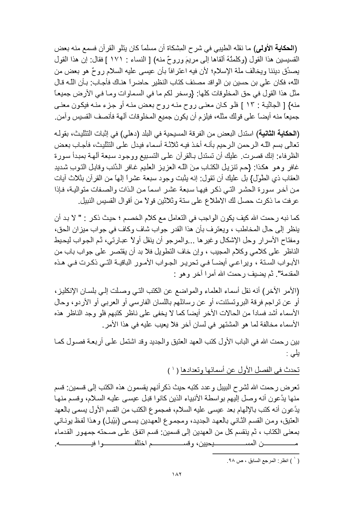 (الحكاية الثانية) استدل البعض من الفرقة المسيحية في البلد (دهلي) في إثبات التثليث، بقوله تعالى بسم الله الرحمن الرحيم بأنه أخذ فيه ثلاثة أسماء فيدل على التثليث، فأجاب بعض الظرفاء: إنك قصرت. عليك أن تستدل بالقرآن على التسبيع ووجود سبعة آلهة بمبدأ سورة غافر وهو هكذا: {حم تنزيل الكتابِ مِنَ الله العزيز العليم غافرِ الذَّنب وقابِل التوبِ شديدِ العقاب ذي الطَّوْل} بل عليك أن تقول: إنه يثبت وجود سبعة عشراً إلهاً من القرآن بثلاث آيات من آخر سورة الحشر التي ذكر فيها سبعة عشر اسماً من الذات والصفات متوالية، فإذا عرفت ما ذكرت حصل لك الاطلاع على ستة وثلاثين قولاً من أقوال القسيس النبيل.