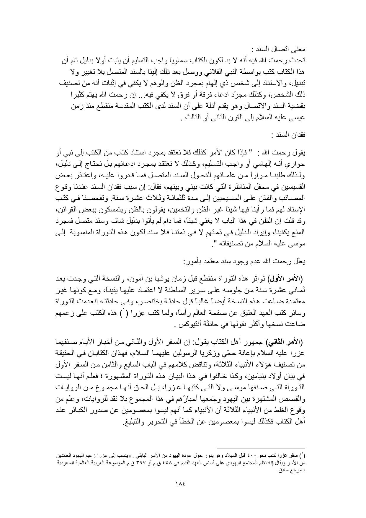 (الأمر الأول) تواتر هذه التوراة منقطع قبل زمان يوشيا بن آمون، والنسخة التي وجدت بعد ثماني عشرة سنة من جلوسه على سرير السلطنة لا اعتماد عليها يقيناً، ومع كونها غير معتمدة ضاعت هذه النسخة أيضاً غالباً قبل حادثة بختنصر، وفي حادثته انعدمت التوراة وسائر كتب العهد العتيق عن صفحة العالم رأساً، ولما كتب عِزرا (¬1) هذه الكتب على زعمهم ضاعت نسخها وأكثر نقولها في حادثة أنتيوكس.