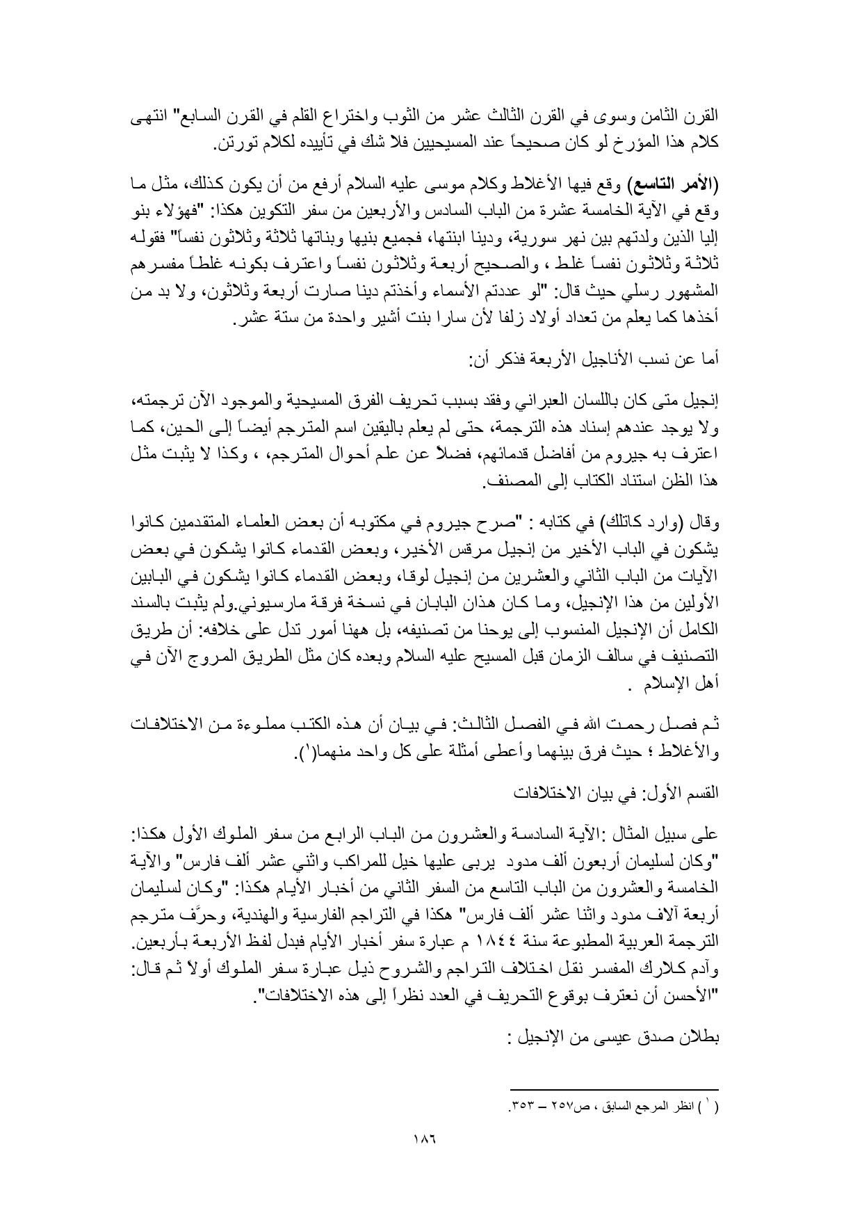(الأمر التاسع) وقع فيها الأغلاط وكلام موسى عليه السلام أرفع من أن يكون كذلك، مثل ما وقع في الآية الخامسة عشرة من الباب السادس والأربعين من سفر التكوين هكذا: "فهؤلاء بنو إليا الذين ولدتهم بين نهر سورية، ودينا ابنتها، فجميع بنيها وبناتها ثلاثة وثلاثون نفساً" فقوله ثلاثة وثلاثون نفساً غلط، والصحيح أربعة وثلاثون نفساً واعترف بكونه غلطاً مفسرهم المشهور رسلي حيث قال: "لو عددتم الأسماء وأخذتم دينا صارت أربعة وثلاثون، ولا بد من أخذها كما يعلم من تعداد أولاد زلفا لأن سارا بنت أشير واحدة من ستة عشر.
