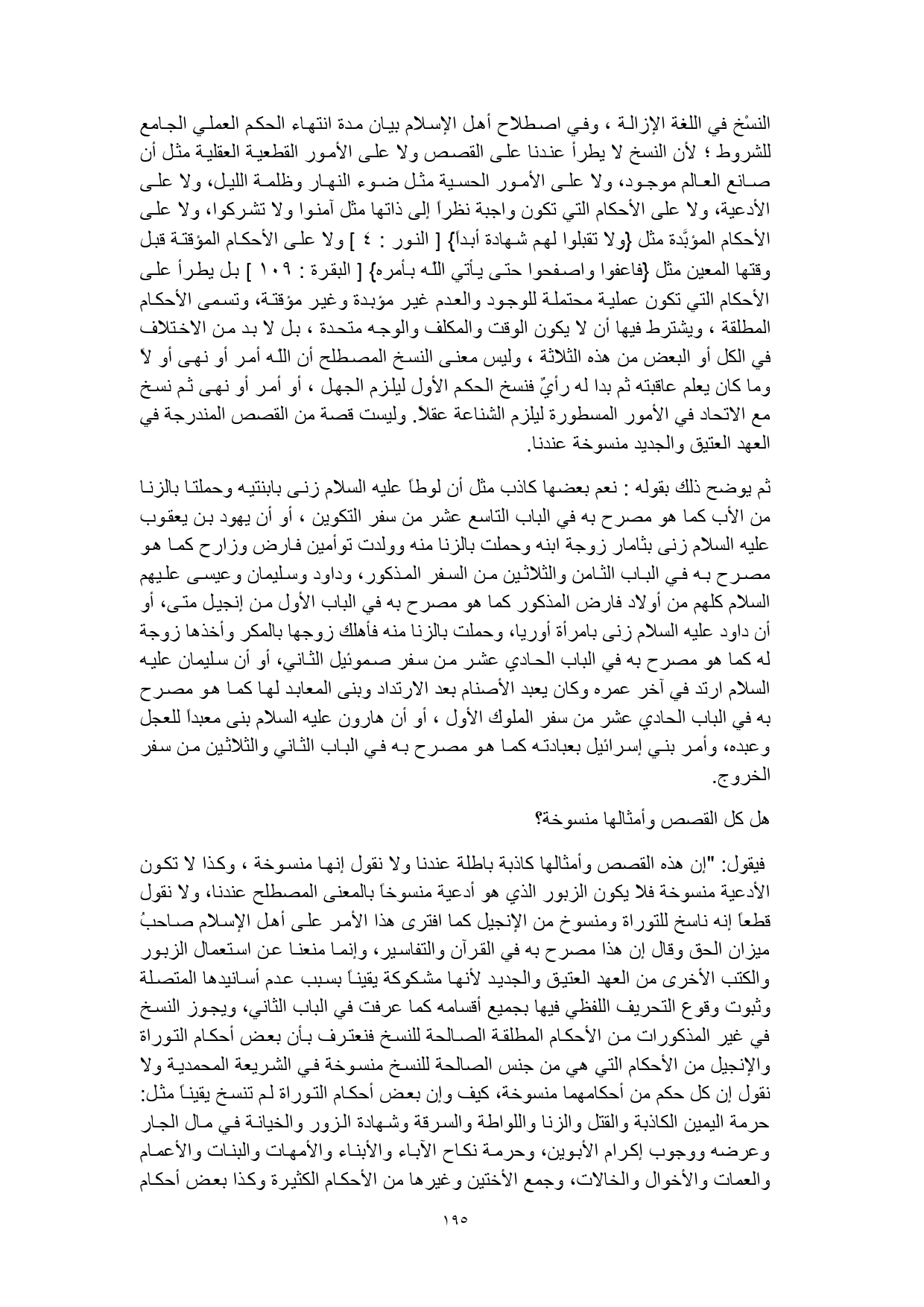 فيقول: "إن هذه القصص وأمثالها كاذبة باطلة عندنا ولا نقول إنها منسوخة، وكذا لا تكون الأدعية منسوخة فلا يكون الزبور الذي هو أدعية منسوخاً بالمعنى المصطلح عندنا، ولا نقول قطعاً إنه ناسخ للتوراة ومنسوخ من الإنجيل كما افترى هذا الأمر على أهل الإسلام صاحبُ ميزان الحق وقال إن هذا مصرح به في القرآن والتفاسير، وإنما منعنا عن استعمال الزبور والكتب الأخرى من العهد العتيق والجديد لأنها مشكوكة يقيناً بسبب عدم أسانيدها المتصلة وثبوت وقوع التحريف اللفظي فيها بجميع أقسامه كما عرفت في الباب الثاني، ويجوز النسخ في غير المذكورات من الأحكام المطلقة الصالحة للنسخ فنعترف بأن بعض أحكام التوراة والإنجيل من الأحكام التي هي من جنس الصالحة للنسخ منسوخة في الشريعة المحمدية ولا نقول إن كل حكم من أحكامهما منسوخة، كيف وإن بعض أحكام التوراة لم تنسخ يقيناً مثل: حرمة اليمين الكاذبة والقتل والزنا واللواطة والسرقة وشهادة الزور والخيانة في مال الجار وعرضه ووجوب إكرام الأبوين، وحرمة نكاح الآباء والأبناء والأمهات والبنات والأعمام والعمات والأخوال والخالات، وجمع الأختين وغيرها من الأحكام الكثيرة وكذا بعض أحكام