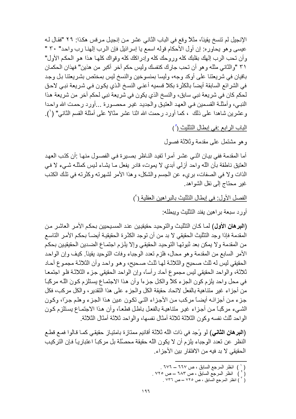 (البرهان الأول) لما كان التثليث والتوحيد حقيقيين عند المسيحيين بحكم الأمر العاشر من المقدمة فإذا وجد التثليث الحقيقي لا بد من أن توجد الكثرة الحقيقية أيضاً بحكم الأمر التاسع من المقدمة ولا يمكن بعد ثبوتها التوحيد الحقيقي وإلا يلزم اجتماع الضدين الحقيقيين بحكم الأمر السابع من المقدمة وهو محال، فلزم تعدد الوجباء وفات التوحيد يقيناً. كيف وإن الواحد الحقيقي ليس له ثلث صحيح والثلاثة لها ثلث صحيح، وهو واحد وأن الثلاثة مجموع آحاد ثلاثة، والواحد الحقيقي ليس مجموع آحاد رأساً، وإن الواحد الحقيقي جزء الثلاثة فلو اجتمعا في محل واحد يلزم كون الجزء كلاً والكل جزءاً وأن هذا الاجتماع يستلزم كونَ الله مركّباً من أجزاء غير متناهية بالفعل لاتحاد حقيقة الكل والجزء على هذا التقدير، والكل مركب، فكل جزء من أجزائه أيضاً مركب من الأجزاء التي تكون عين هذا الجزء وهلم جرّا، وكون الشيء مركّباً من أجزاء غير متناهية بالفعل باطل قطعاً، وأن هذا الاجتماع يستلزم كون الواحد ثُلث نفسه وكون الثلاثة ثلاثة أمثال نفسها، والواحد ثلاثة أمثال الثلاثة.