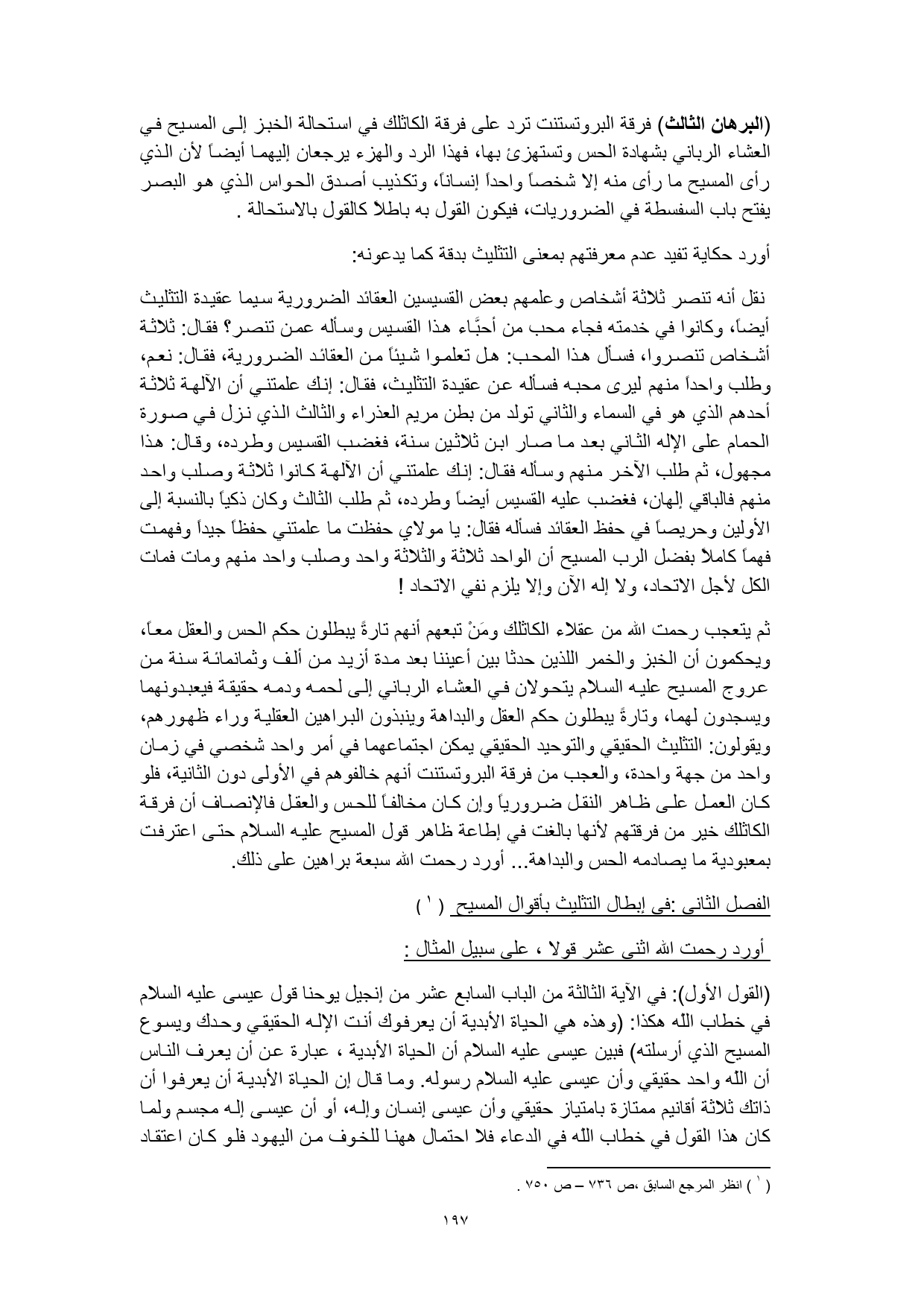 (البرهان الثالث) فرقة البروتستنت ترد على فرقة الكاثلك في استحالة الخبز إلى المسيح في العشاء الرباني بشهادة الحس وتستهزئ بها، فهذا الرد والهزء يرجعان إليهما أيضاً لأن الذي رأى المسيح ما رأى منه إلا شخصاً واحداً إنساناً، وتكذيب أصدق الحواس الذي هو البصر يفتح باب السفسطة في الضروريات، فيكون القول به باطلاً كالقول بالاستحالة.
