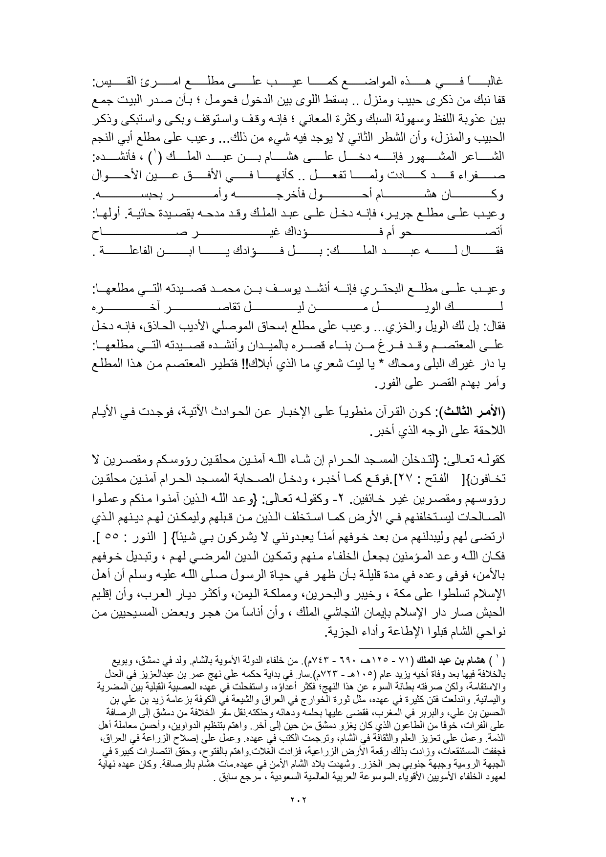 قفا نبك من ذكرى حبيب ومنزل .. بسقط اللوى بين الدخول فحومل؛ بأن صدر البيت جمع بين عذوبة اللفظ وسهولة السبك وكثرة المعاني؛ فإنه وقف واستوقف وبكى واستبكى وذكر الحبيب والمنزل، وأن الشطر الثاني لا يوجد فيه شيء من ذلك ... وعيب على مطلع أبي النجم الشاعر المشهور فإنه دخل على هشام بن عبد الملك (¬1)،