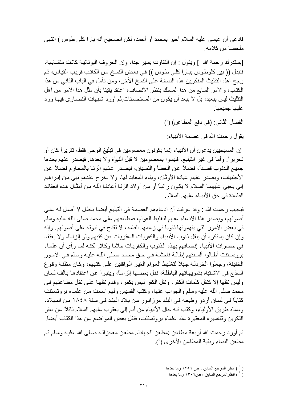 [يستدرك رحمة الله] ويقول: إن التفاوت يسير جدا، وإن الحروف اليونانية كانت متشابهة، فتبدل ((بير كلوطوس ببارا كلي طوس)) في بعض النسخ من الكاتب قريب القياس، ثم رجح أهل التثليث المنكرين هذه النسخة على النسخ الأخر، ومن تأمل في الباب الثاني من هذا الكتاب، والأمر السابع من هذا المسلك بنظر الانصاف، اعتقد يقينا بأن مثل هذا الأمر من أهل التثليث ليس ببعيد، بل لا يبعد أن يكون من المستحسنات. ثم أورد شبهات النصارى فيها ورد عليها جميعها.