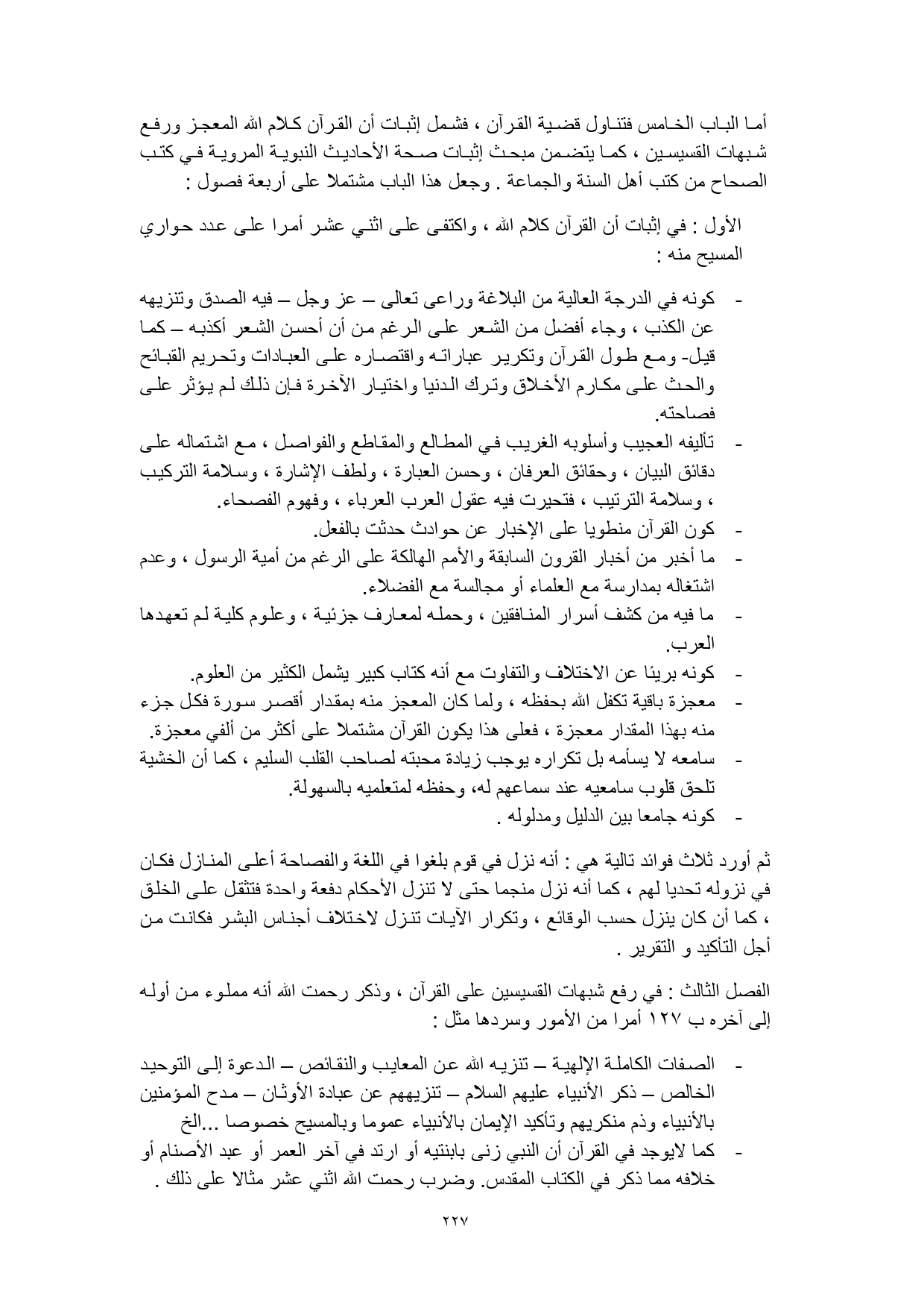أما الباب الخامس فتناول قضية القرآن، فشمل إثبات أن القرآن كلام الله المعجز ورفع شبهات القسيسين، كما يتضمن مبحث إثبات صحة الأحاديث النبوية المروية في كتب الصحاح من كتب أهل السنة والجماعة. وجعل هذا الباب مشتملا على أربعة فصول: