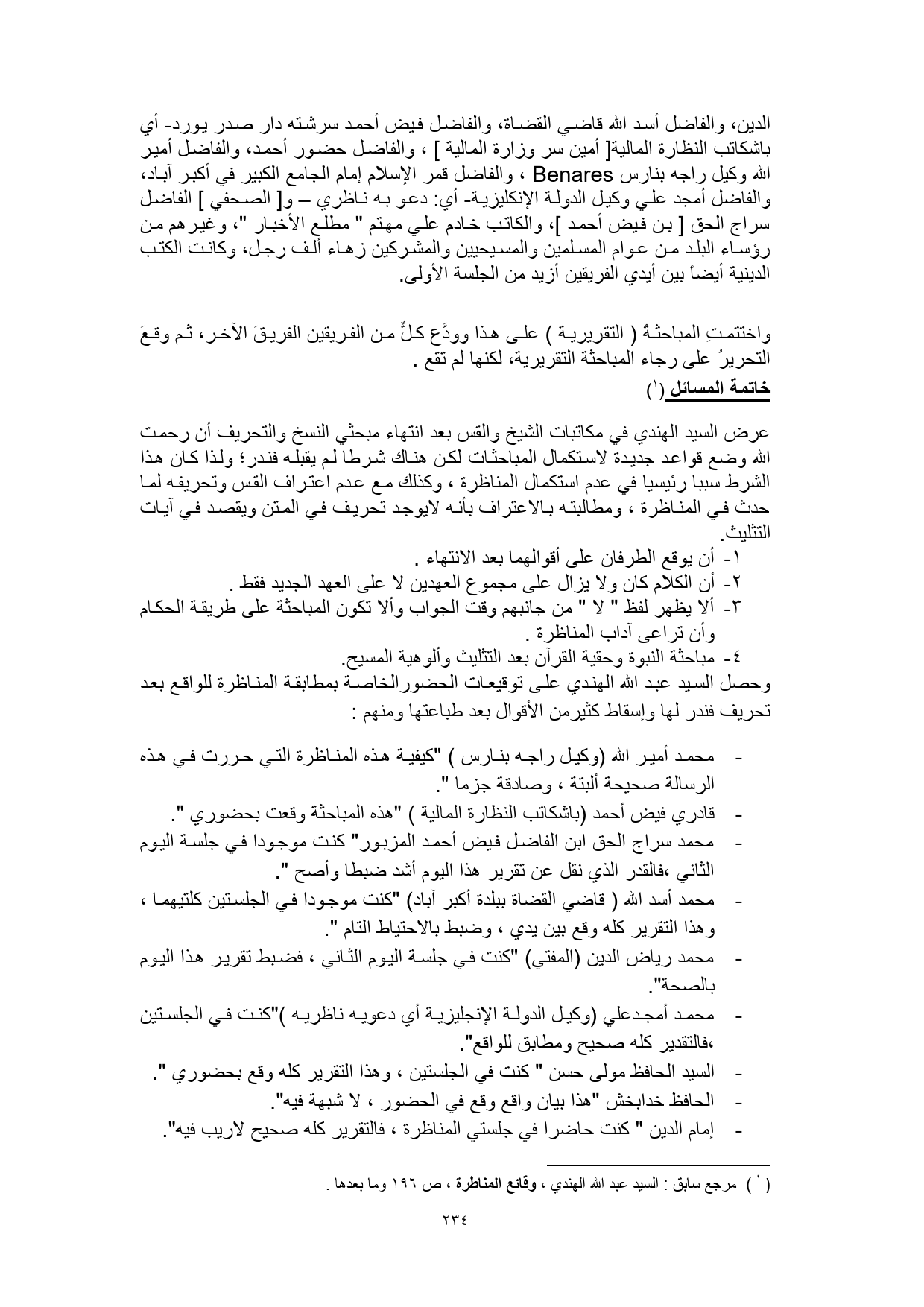 (¬1) مرجع سابق: السيد عبد الله الهندي، وقائع المناطرة، ص 196 وما بعدها.