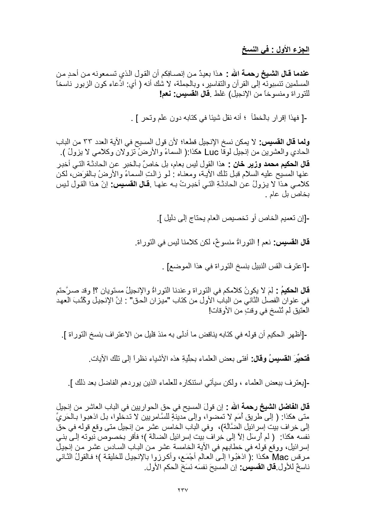 قال الحكيمُ: لِمَ لا يكونُ كلامكم في التوراة وعندنا التوراةُ والإنجيلُ مستويان؟ ! وقد صرَّحتم في عنوان الفصل الثاني من الباب الأول من كتاب "ميزان الحق": إنَّ الإنجيل وكُتُبَ العهد العتيق لم تُنْسخ في وقتٍ من الأوقات!