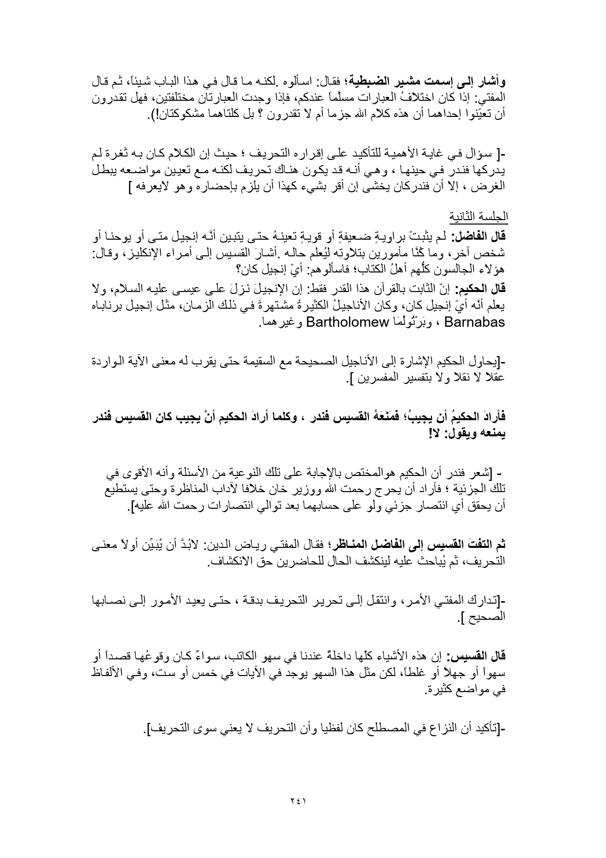 وأشار إلى إسمت مشير الضبطية؛ فقال: اسألوه. لكنه ما قال في هذا الباب شيئاً، ثم قال المفتي: إذا كان اختلافُ العبارات مسلَّماً عندكم، فإذا وجدت العبارتان مختلفتين، فهل تقدرون أن تعيّنوا إحداهما أن هذه كلام الله جزما أم لا تقدرون؟ بل كلتاهما مشكوكتان! ).