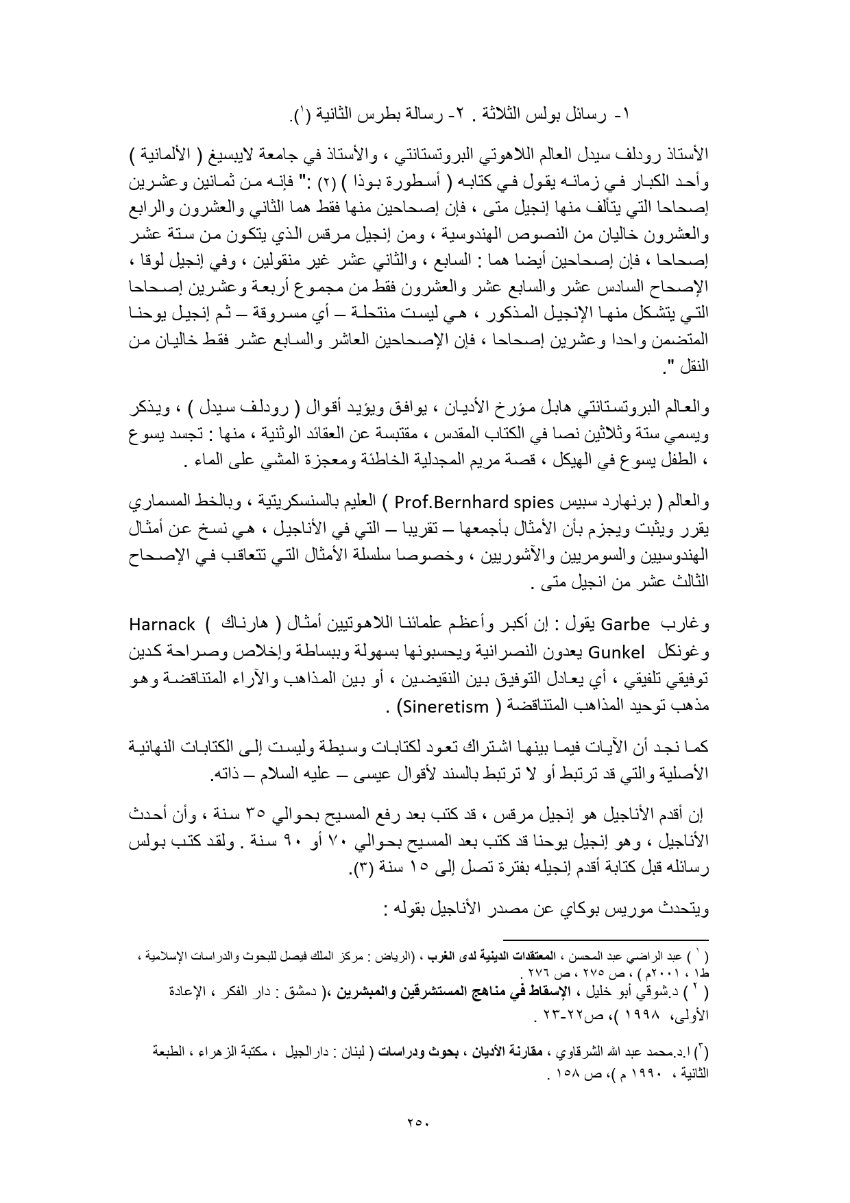 الأستاذ رودلف سيدل العالم اللاهوتي البروتستانتي، والأستاذ في جامعة لايبسيغ (الألمانية) وأحد الكبار في زمانه يقول في كتابه (أسطورة بوذا) (¬2): " فإنه من ثمانين وعشرين إصحاحا التي يتألف منها إنجيل متى، فإن إصحاحين منها فقط هما الثاني والعشرون والرابع والعشرون خاليان من النصوص الهندوسية، ومن إنجيل مرقس الذي يتكون من ستة عشر إصحاحا، فإن إصحاحين أيضا هما: السابع، والثاني عشر غير منقولين، وفي إنجيل لوقا، الإصحاح السادس عشر والسابع عشر والعشرون فقط من مجموع أربعة وعشرين إصحاحا التي يتشكل منها الإنجيل المذكور، هي ليست منتحلة - أي مسروقة - ثم إنجيل يوحنا المتضمن واحدا وعشرين إصحاحا، فإن الإصحاحين العاشر والسابع عشر فقط خاليان من النقل ".
