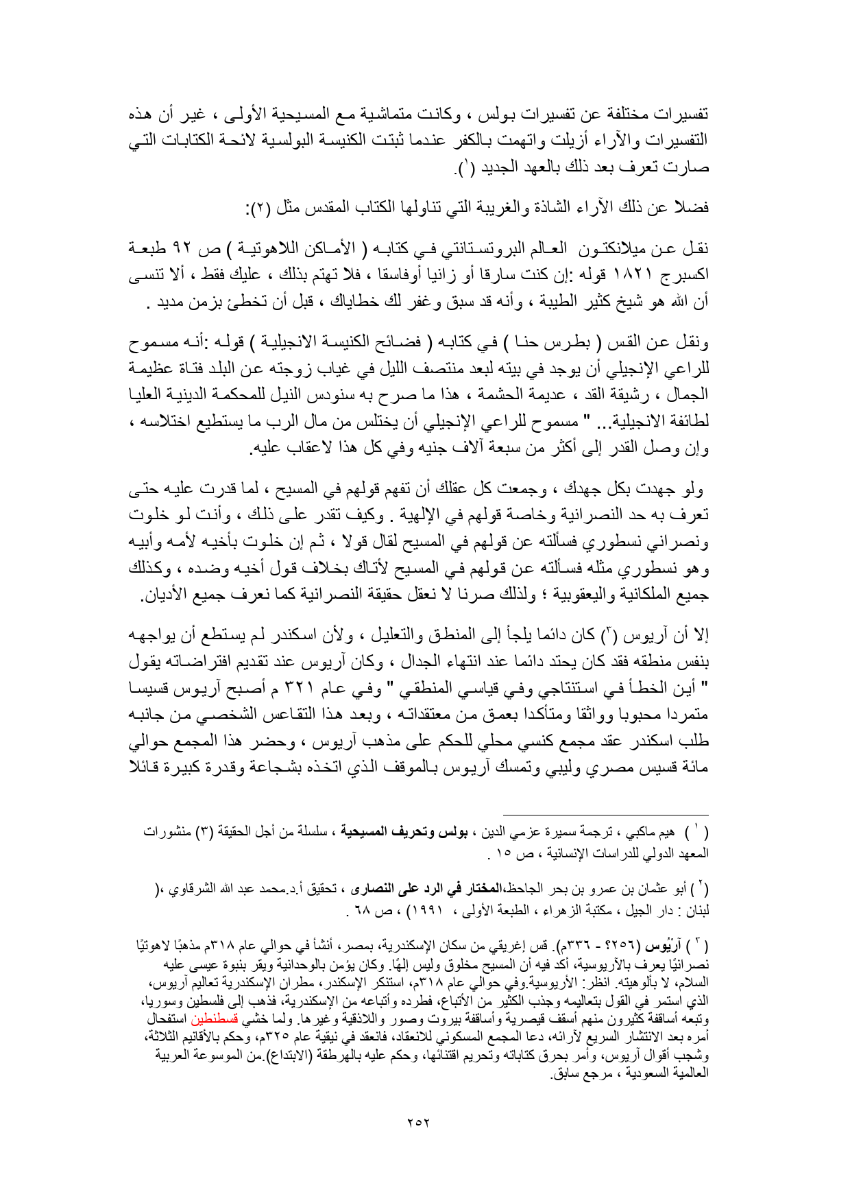 (¬3) آرْيُوس (256؟ - 336 م). قس إغريقي من سكان الإسكندرية، بمصر، أنشأ في حوالي عام 318 م مذهبًا لاهوتيًا نصرانيًا يعرف بالآريوسية، أكد فيه أن المسيح مخلوق وليس إلهًا. وكان يؤمن بالوحدانية ويقر بنبوة عيسى عليه السلام، لا بألوهيته. انظر: الأريوسية. وفي حوالي عام 318 م، استنكر الإسكندر، مطران الإسكندرية تعاليم آريوس، الذي استمر في القول بتعاليمه وجذب الكثير من الأتباع، فطرده وأتباعه من الإسكندرية، فذهب إلى فلسطين وسوريا، وتبعه أساقفة كثيرون منهم أسقف قيصرية وأساقفة بيروت وصور واللاذقية وغيرها. ولما خشي قسطنطين استفحال أمره بعد الانتشار السريع لآرائه، دعا المجمع المسكوني للانعقاد، فانعقد في نيقية عام 325 م، وحكم بالأقانيم الثلاثة، وشجب أقوال آريوس، وأمر بحرق كتاباته وتحريم اقتنائها، وحكم عليه بالهرطقة (الابتداع). من الموسوعة العربية العالمية السعودية، مرجع سابق.