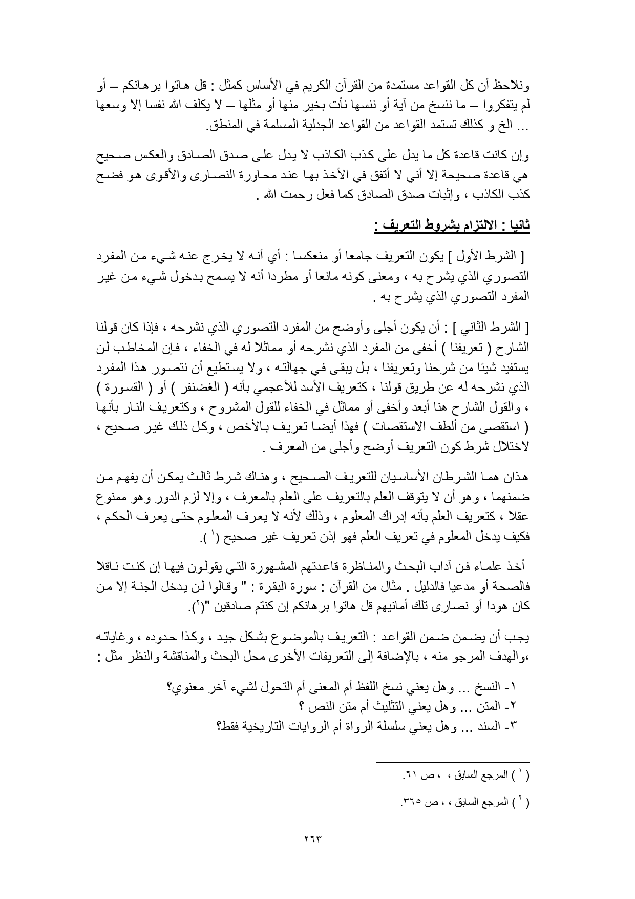 ونلاحظ أن كل القواعد مستمدة من القرآن الكريم في الأساس كمثل: قل هاتوا برهانكم - أو لم يتفكروا - ما ننسخ من آية أو ننسها نأت بخير منها أو مثلها - لا يكلف الله نفسا إلا وسعها ... الخ وكذلك تستمد القواعد من القواعد الجدلية المسلمة في المنطق.