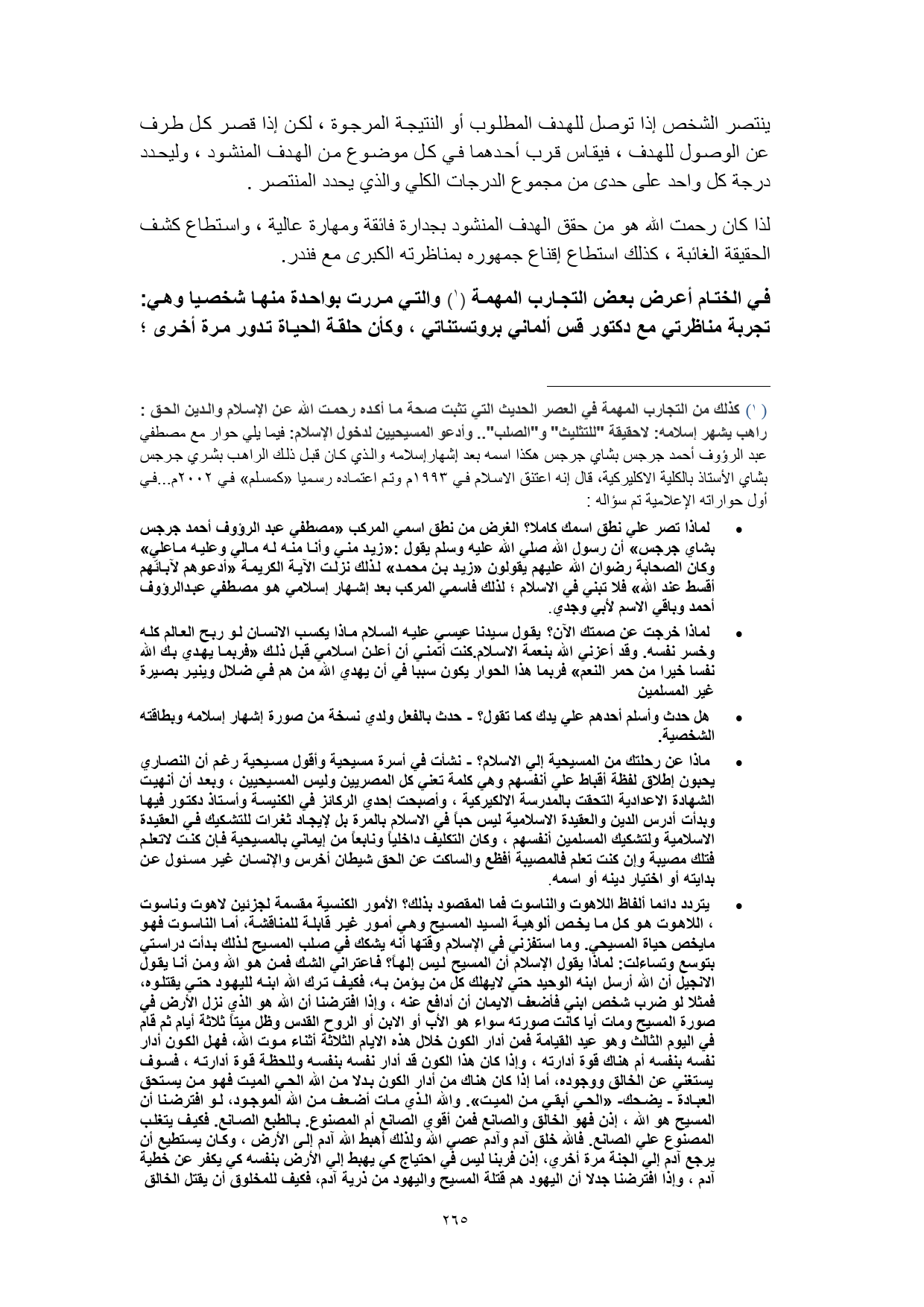 (¬1) كذلك من التجارب المهمة في العصر الحديث التي تثبت صحة ما أكده رحمت الله عن الإسلام والدين الحق: راهب يشهر إسلامه: لاحقيقة "للتثليث" و"الصلب" .. وأدعو المسيحيين لدخول الإسلام: فيما يلي حوار مع مصطفي عبد الرؤوف أحمد جرجس بشاي جرجس هكذا اسمه بعد إشهارإسلامه والذي كان قبل ذلك الراهب بشري جرجس بشاي الأستاذ بالكلية الاكليركية، قال إنه اعتنق الاسلام في 1993 م وتم اعتماده رسميا «كمسلم» في 2002 م ... في أول حواراته الإعلامية تم سؤاله: