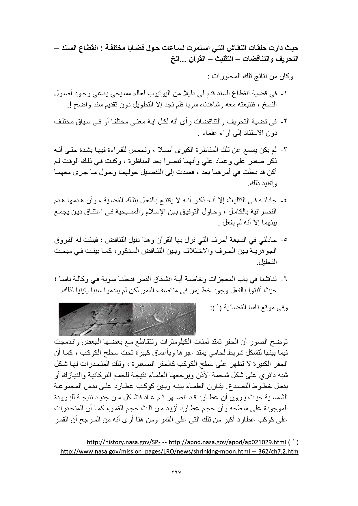 6 - تناقشنا في باب المعجزات وخاصة آية انشقاق القمر فبحثنا سوية في وكالة ناسا؛ حيث أثبتوا بالفعل وجود خط يمر في منتصف القمر لكن لم يقدموا سببا يقينيا لذلك.