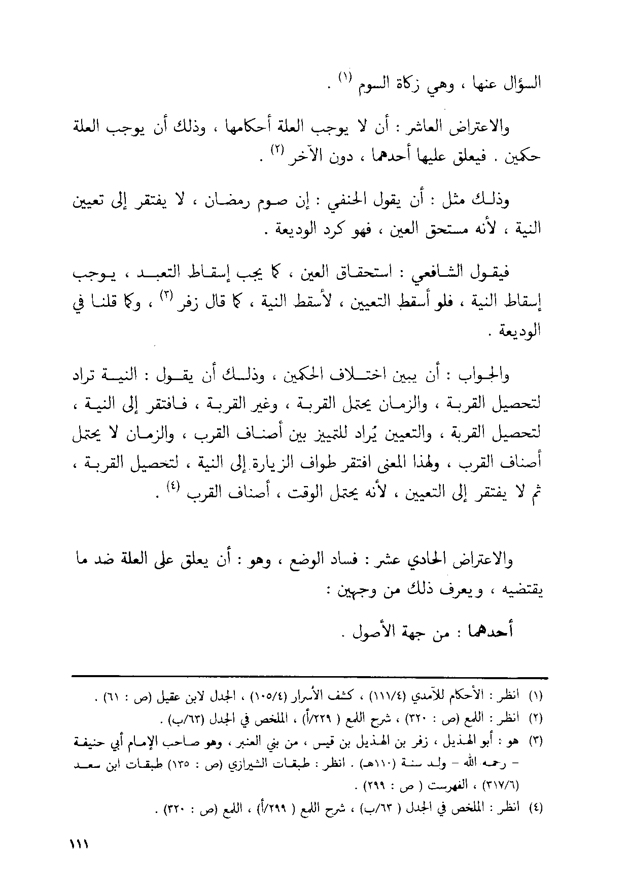 والاعتراض الْعَاشِر ان لَا يُوجب الْعلَّة احكامها وَذَلِكَ ان يُوجب الْعلَّة حكمين فيعلق عَلَيْهَا احدهما دون الاخر