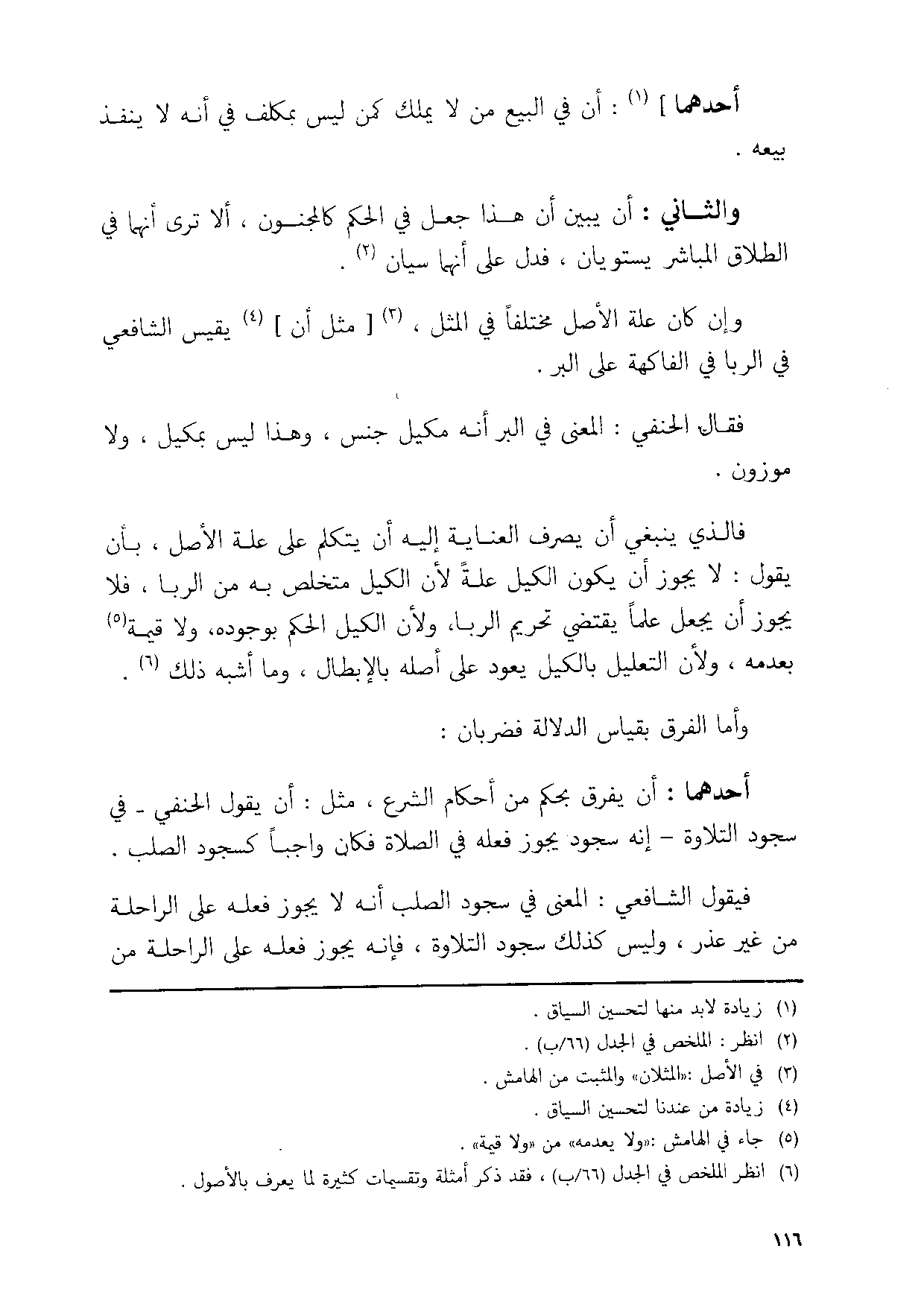 احدهما ان يفرق بِحكم من احكام الشَّرْع مثل ان يَقُول الْحَنَفِيّ فِي سُجُود التِّلَاوَة انه سُجُود يجوز فعله فِي الصَّلَاة فَكَانَ وَاجِبا كسجود الصلب