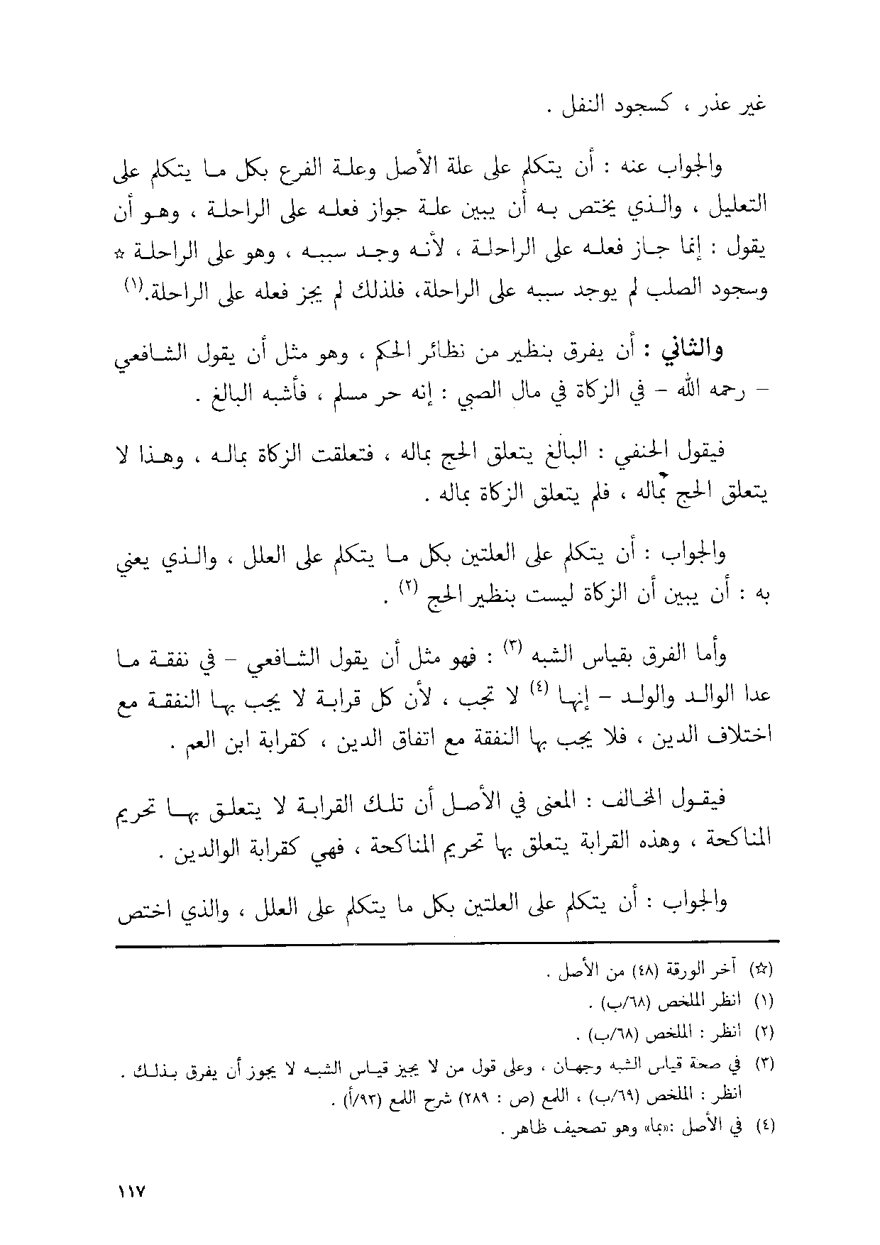 وَالْجَوَاب عَنهُ ان يتَكَلَّم على عِلّة الاصل وَعلة الْفَرْع بِكُل مَا يتَكَلَّم على التَّعْلِيل وَالَّذِي يخْتَص بِهِ ان يبين عِلّة جَوَاز فعله على الرَّاحِلَة وَهُوَ ان يَقُول انما جَازَ فعله على الرَّاحِلَة لانه وجد سَببه وَهُوَ على الرَّاحِلَة وَسُجُود الصلب لم يُوجد سَببه على الرَّاحِلَة فَلذَلِك لم يجز فعله على الرَّاحِلَة