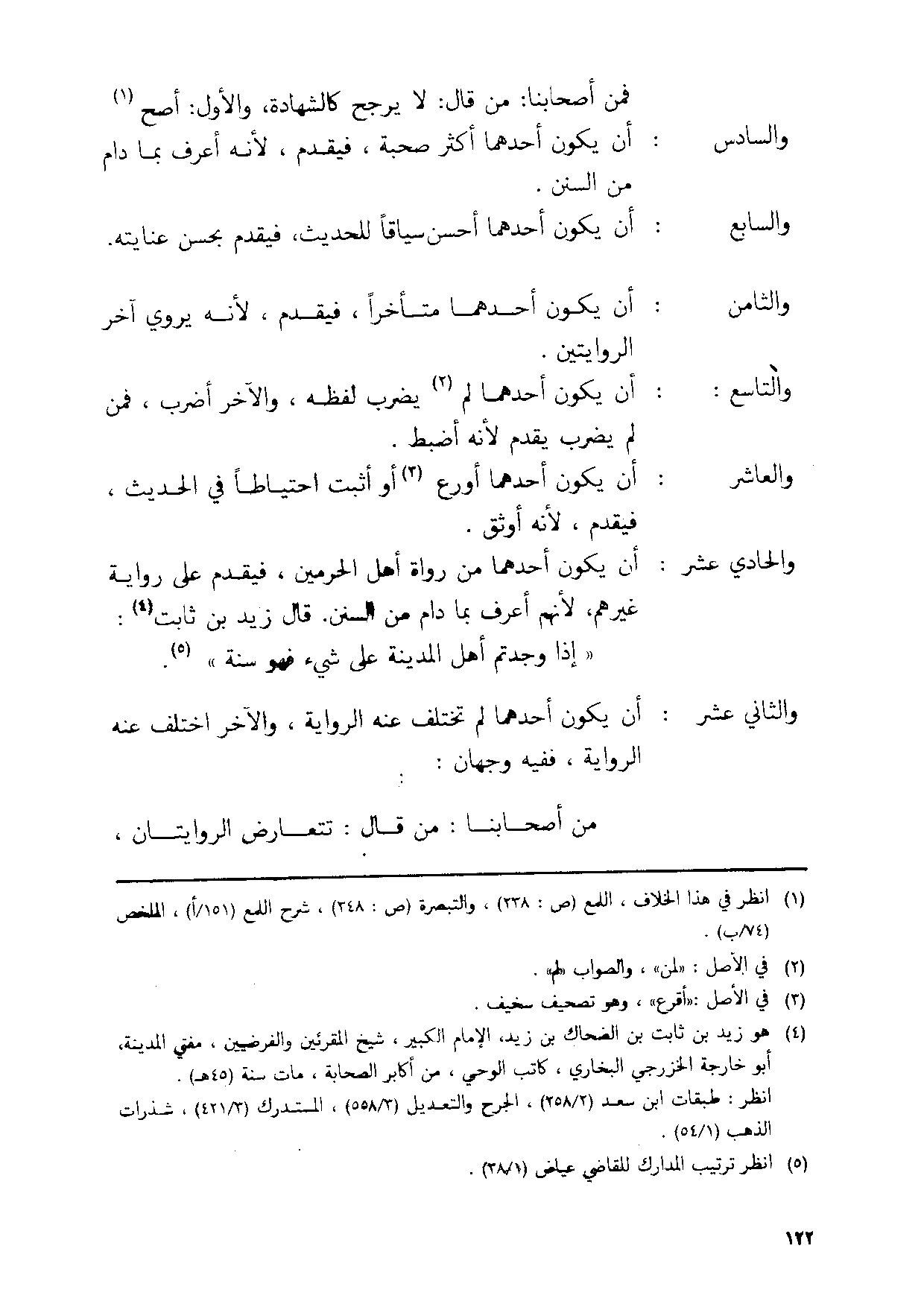وَالْحَادِي عشر ان يكون احدهما من رُوَاة اهل الْحَرَمَيْنِ فَيقدم على رِوَايَة غَيرهم لانهم اعرف بِمَا دَامَ من السّنَن قَالَ زيد بن ثَابت اذا وجدْتُم اهل الْمَدِينَة على شَيْء فَهُوَ سنة