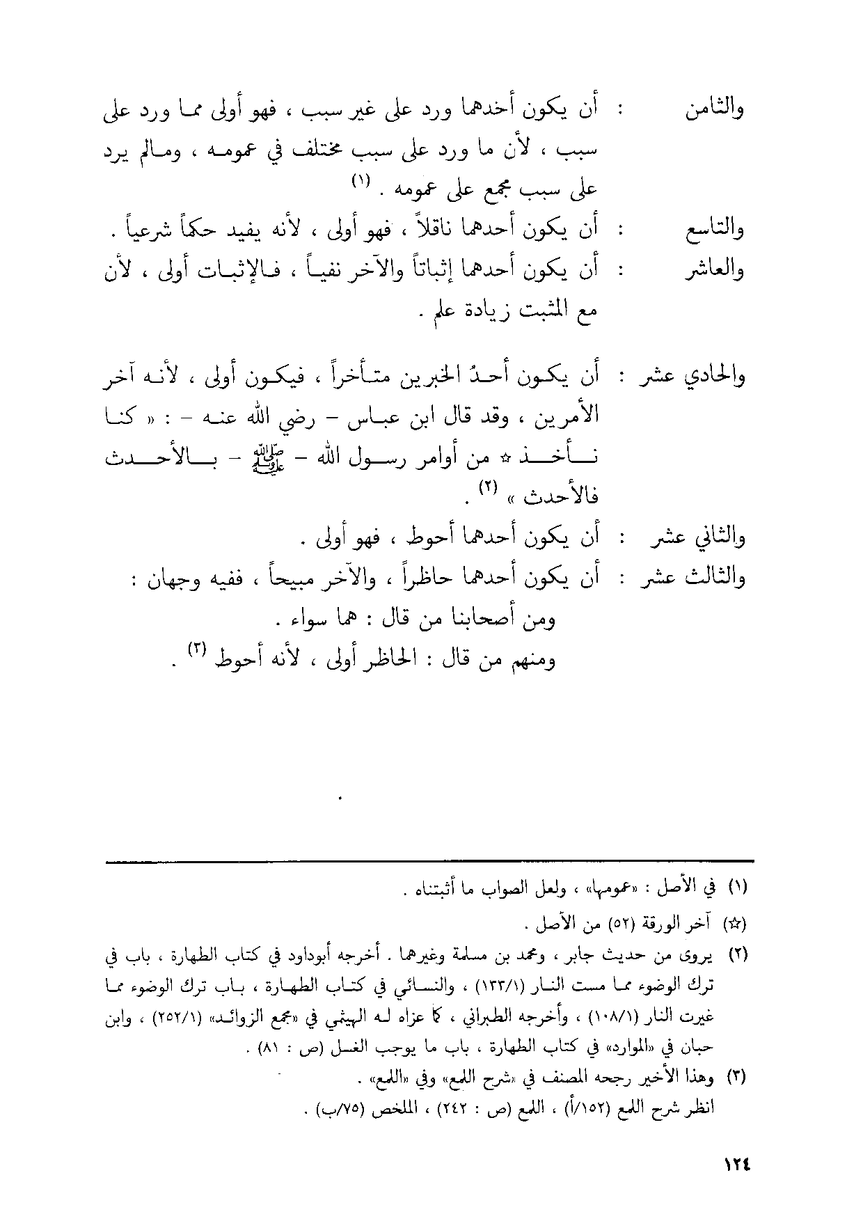 والعاشر ان يكون احدهما اثباتا والاخر نفيا فالاثبات اولى لَان مَعَ الْمُثبت زِيَادَة علم