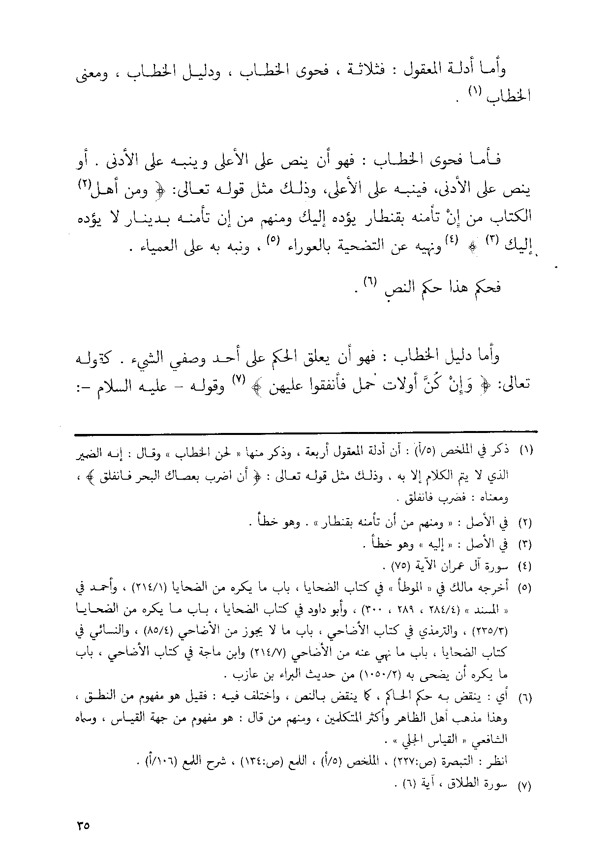 فاما فحوى الْخطاب فَهُوَ ان ينص على الاعلى وينبه على الادنى اَوْ ينص على الادنى فينبه على الاعلى وَذَلِكَ مثل قَوْله تَعَالَى {وَمن أهل الْكتاب من إِن تأمنه بقنطار يؤده إِلَيْك وَمِنْهُم من إِن تأمنه بِدِينَار لَا يؤده إِلَيْك} وَنَهْيه عَن التَّضْحِيَة بالعوراء وَنبهَ بِهِ على العمياء // أخرجه مَالك وَغَيره