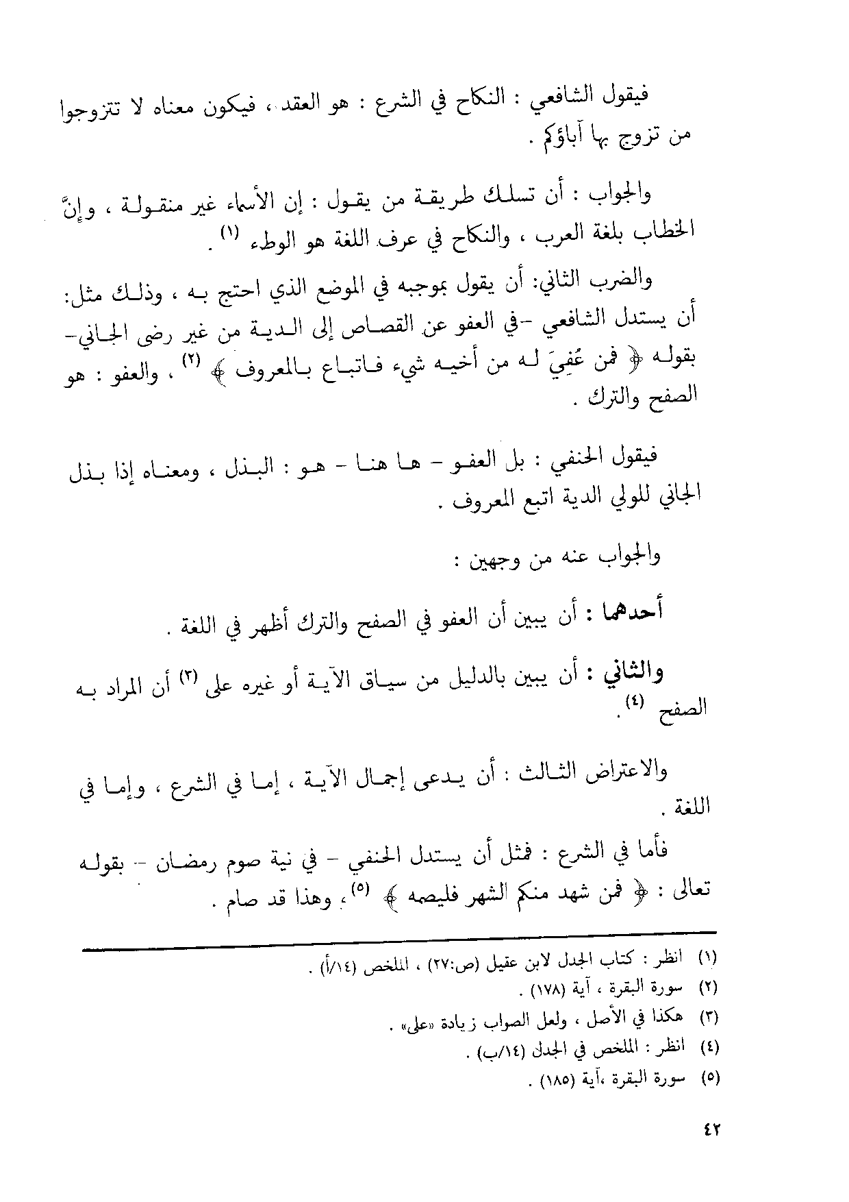وَالضَّرْب الثَّانِي ان يَقُول بِمُوجبِه فِي الْموضع الَّذِي احْتج بِهِ وَذَلِكَ مثل ان يسْتَدلّ الشَّافِعِي فِي الْعَفو عَن الْقصاص الى الدِّيَة من غير رضى الْجَانِي بقوله {فَمن عُفيَ لَهُ من أَخِيه شَيْء فاتباع بِالْمَعْرُوفِ} وَالْعَفو هُوَ الصفح وَالتّرْك