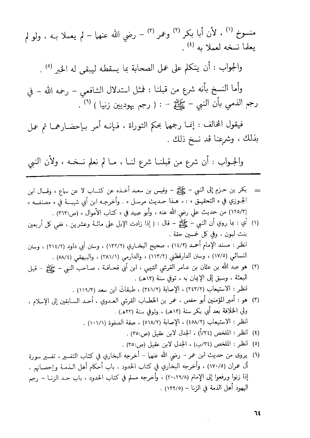 واما النّسخ لانه شرع من قبلنَا فَمثل اسْتِدْلَال الشَّافِعِي رَحمَه الله فِي رجم الذِّمِّيّ بَان النَّبِي صلى الله عَلَيْهِ وَسلم رجم يهوديين زَنَيَا