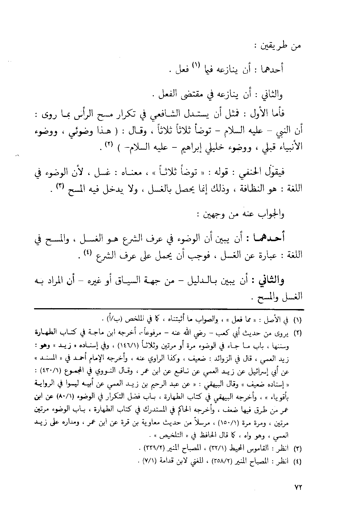 احدهما ان يبين ان الْوضُوء فِي عرف الشَّرْع هُوَ الْغسْل وَالْمسح فِي اللُّغَة عبارَة عَن الْغسْل فَوَجَبَ ان يحمل على عرف الشَّرْع
