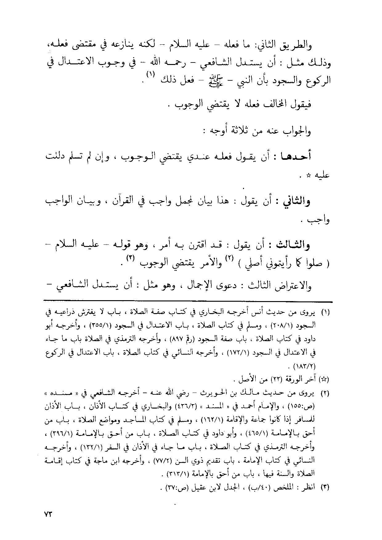 وَالطَّرِيق الثَّانِي مَا فعله عَلَيْهِ السَّلَام وَلكنه ينازعه فِي مُقْتَضى فعله وَذَلِكَ مثل ان يسْتَدلّ الشَّافِعِي رَحمَه الله فِي وجوب الِاعْتِدَال فِي الرُّكُوع وَالسُّجُود بَان النَّبِي صلى الله عَلَيْهِ وَسلم فعل ذَلِك // أخرجه البُخَارِيّ وَمُسلم غَيرهم