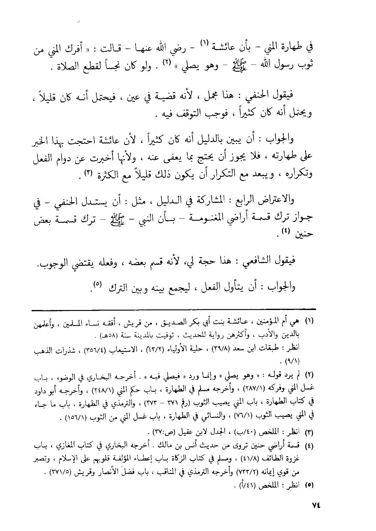 فِي طَهَارَة الْمَنِيّ لَان عَائِشَة رَضِي الله عَنْهَا قَالَت افرك الْمَنِيّ من ثوب رَسُول الله صلى الله عَلَيْهِ وَسلم وَهُوَ يُصَلِّي وَلَو كَانَ نجسا لقطع الصَّلَاة // أخرجه البُخَارِيّ وَغَيره