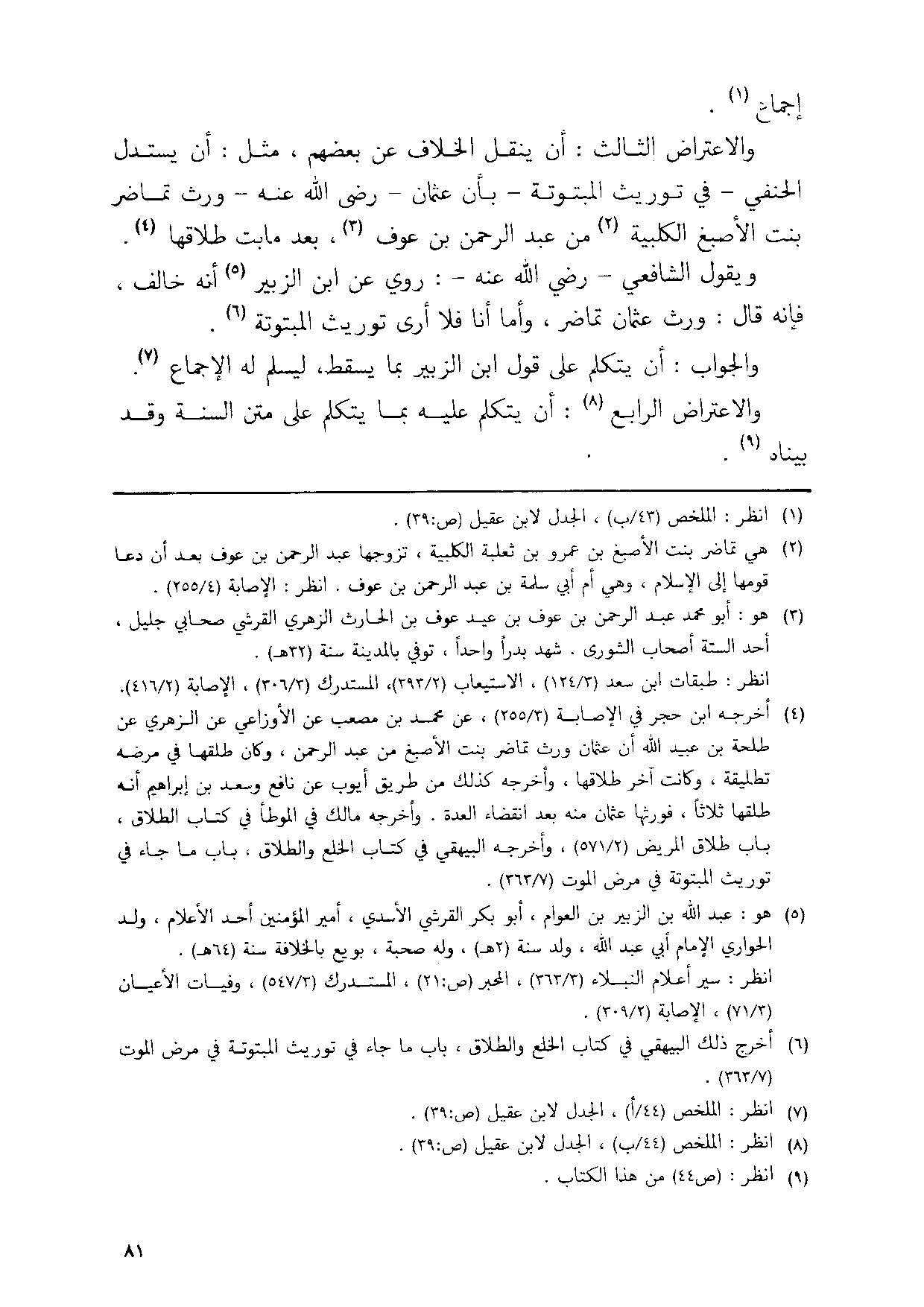 والاعتراض الثَّالِث ان ينْقل الْخلاف عَن بَعضهم مثل ان يسْتَدلّ الْحَنَفِيّ فِي تَوْرِيث المبتوتة بَان عُثْمَان رَضِي الله عَنهُ ورث تماضر بنت الاصبغ الْكَلْبِيَّة من عبد الرَّحْمَن بن عَوْف بعد مابت طَلاقهَا // أخرجه ابْن حجر فِي الإصابه