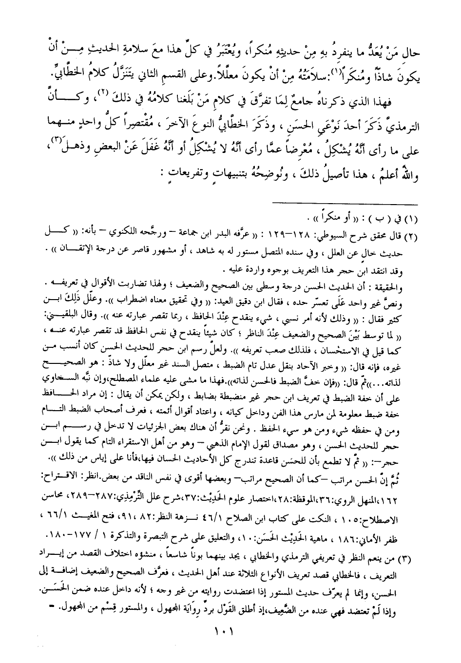 (¬2) قال محقق شرح السيوطي: 128 - 129: ((عرَّفه البدر ابن جماعة - ورجَّحه اللكنوي - بأنه: ((كل حديث خالٍ عن العلل، وفي سنده المتصل مستور له به شاهد، أو مشهور قاصر عن درجة الإتقان)). وقد انتقد ابن حجر هذا التعريف بوجوه واردة عليه.