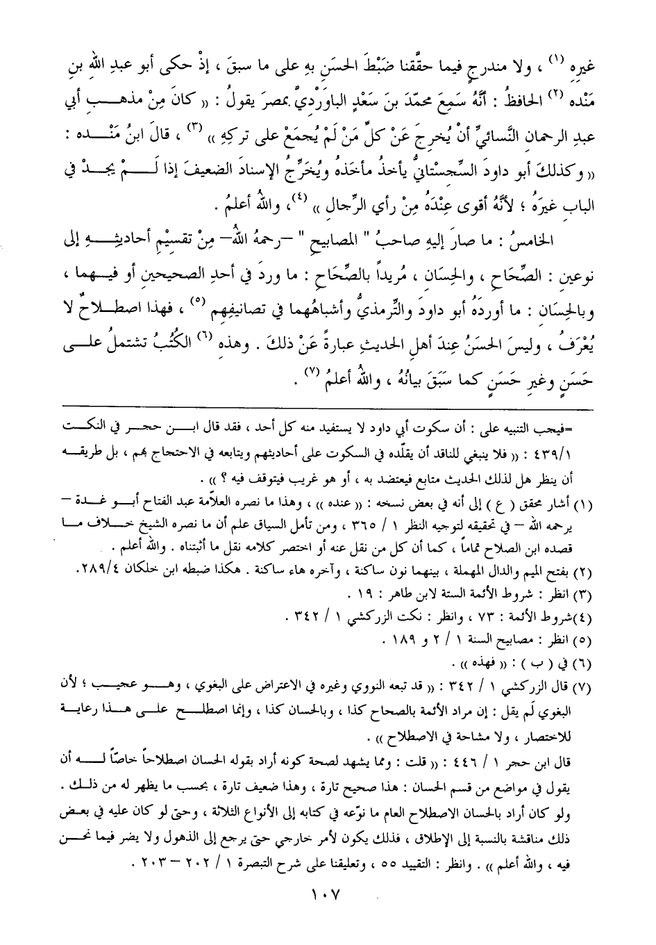 قال ابن حجر 1/ 446: ((قلت: ومما يشهد لصحة كونه أراد بقوله الحسان اصطلاحاً خاصّاً له أن يقول في مواضع من قسم الحسان: هذا صحيح تارة، وهذا ضعيف تارة، بحسب ما يظهر له من ذلك. ولو كان أراد بالحسان الاصطلاح العام ما نوّعه في كتابه إلى الأنواع الثلاثة، وحتى لو كان عليه في بعض ذلك مناقشة بالنسبة إلى الإطلاق، فذلك يكون لأمر خارجي حتى يرجع إلى الذهول ولا يضر فيما نحن فيه، والله أعلم)). وانظر: التقييد 55، وتعليقنا على شرح التبصرة 1/ 202 - 203.