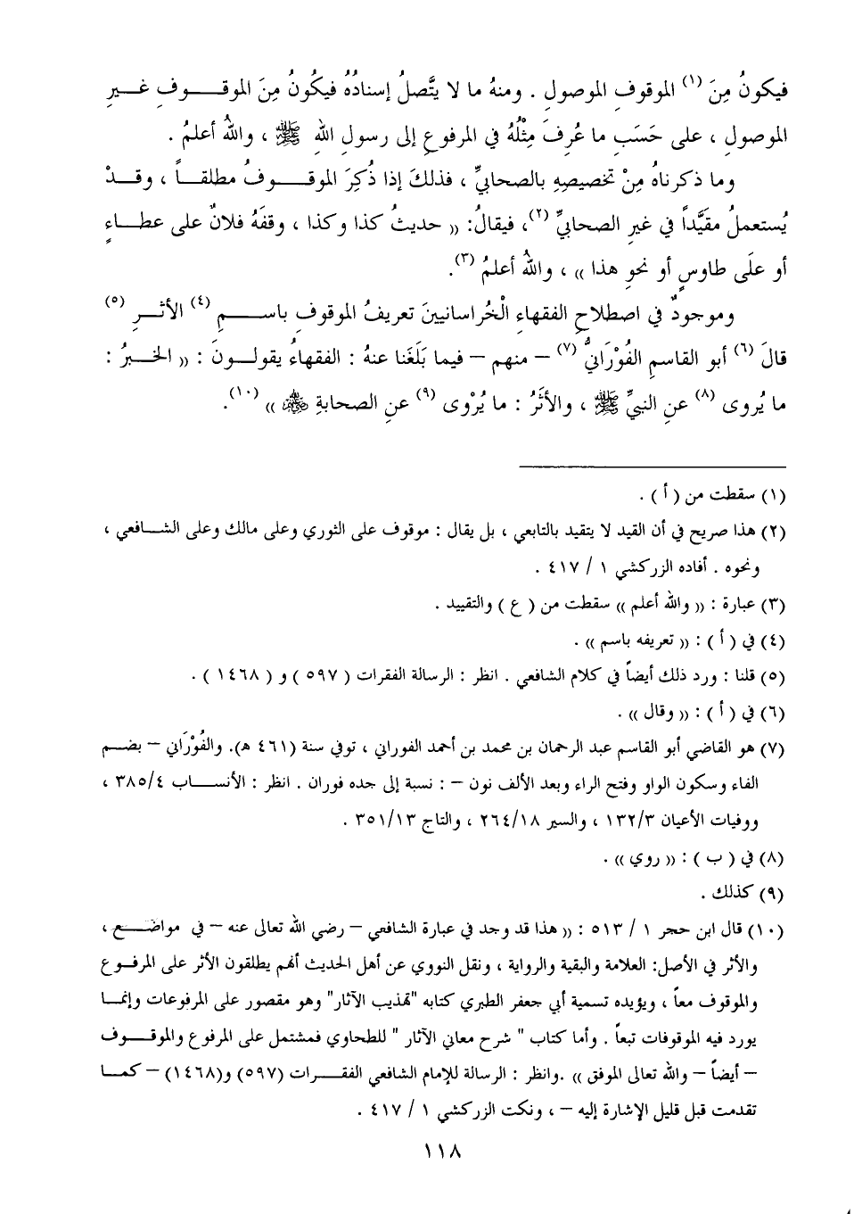 وموجودٌ في اصطلاحِ الفقهاءِ الْخُراسانيينَ تعريفُ الموقوفِ باسمِ (¬4) الأثرِ (¬5)