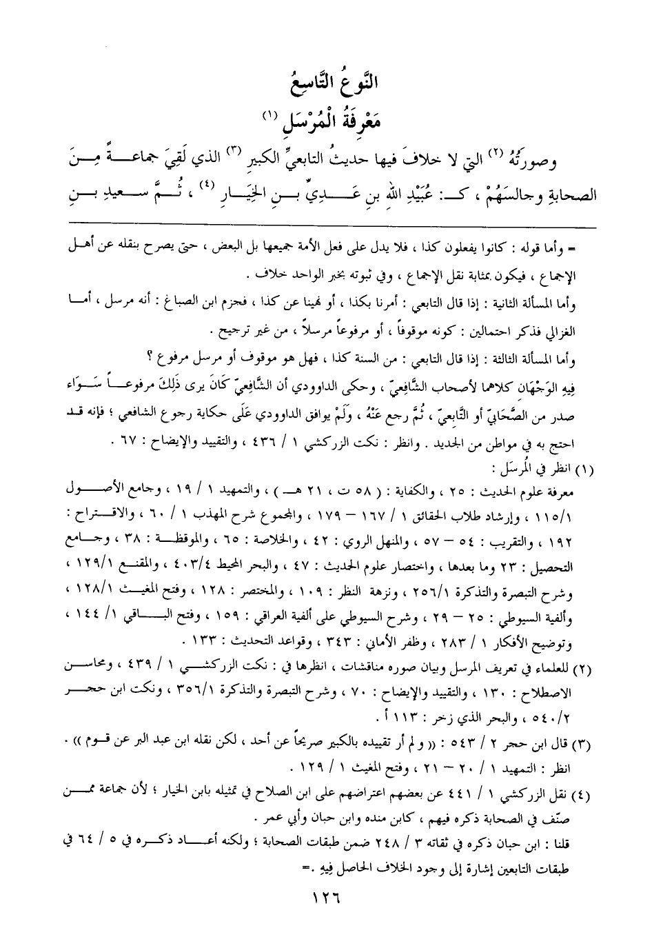 (¬2) للعلماء في تعريف المرسل وبيان صوره مناقشات، انظرها في: نكت الزركشي 1/ 439، ومحاسن الاصطلاح: 130، والتقييد والإيضاح: 70، وشرح التبصرة والتذكرة 1/ 356، ونكت ابن حجر 2/ 540، والبحر الذي زخر: 113 أ.