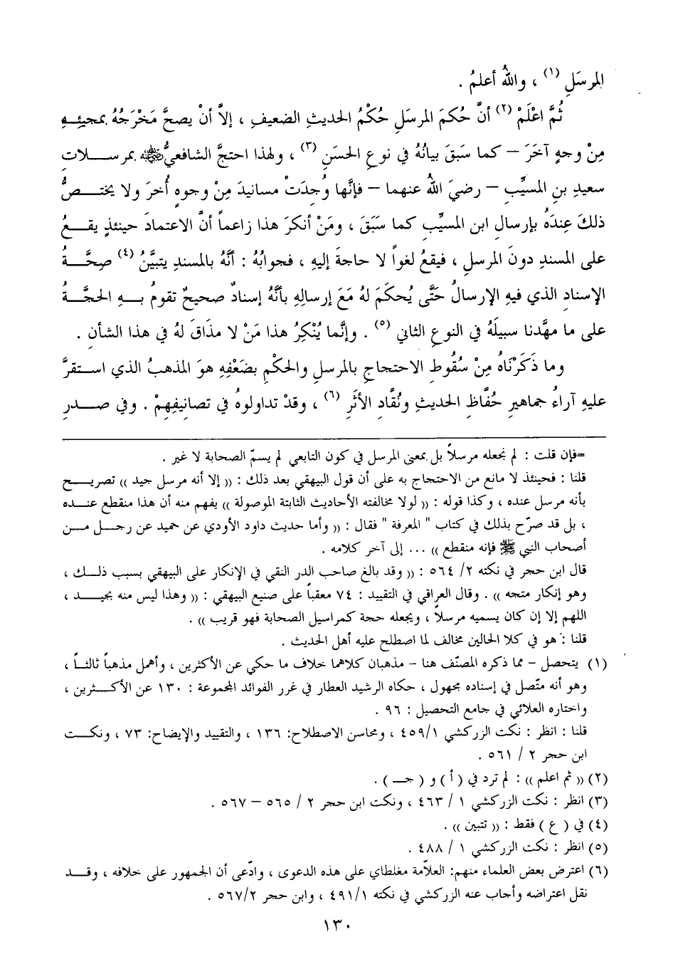(¬6) اعترض بعض العلماء منهم: العلاّمة مغلطاي على هذه الدعوى، وادّعى أن الجمهور على خلافه، وقد نقل اعتراضه وأجاب عنه الزركشي في نكته 1/ 491، وابن حجر 2/ 567.